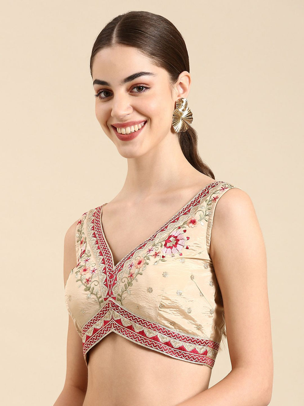 This elegant beige silk saree blouse features intricate thread embroidery and a chic V-neck design, perfect for a refined fusion look.