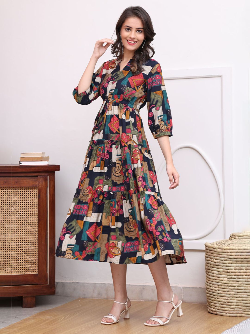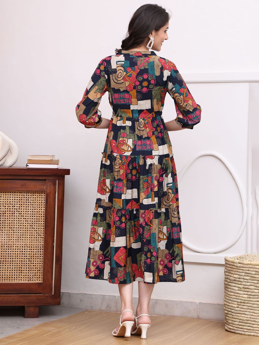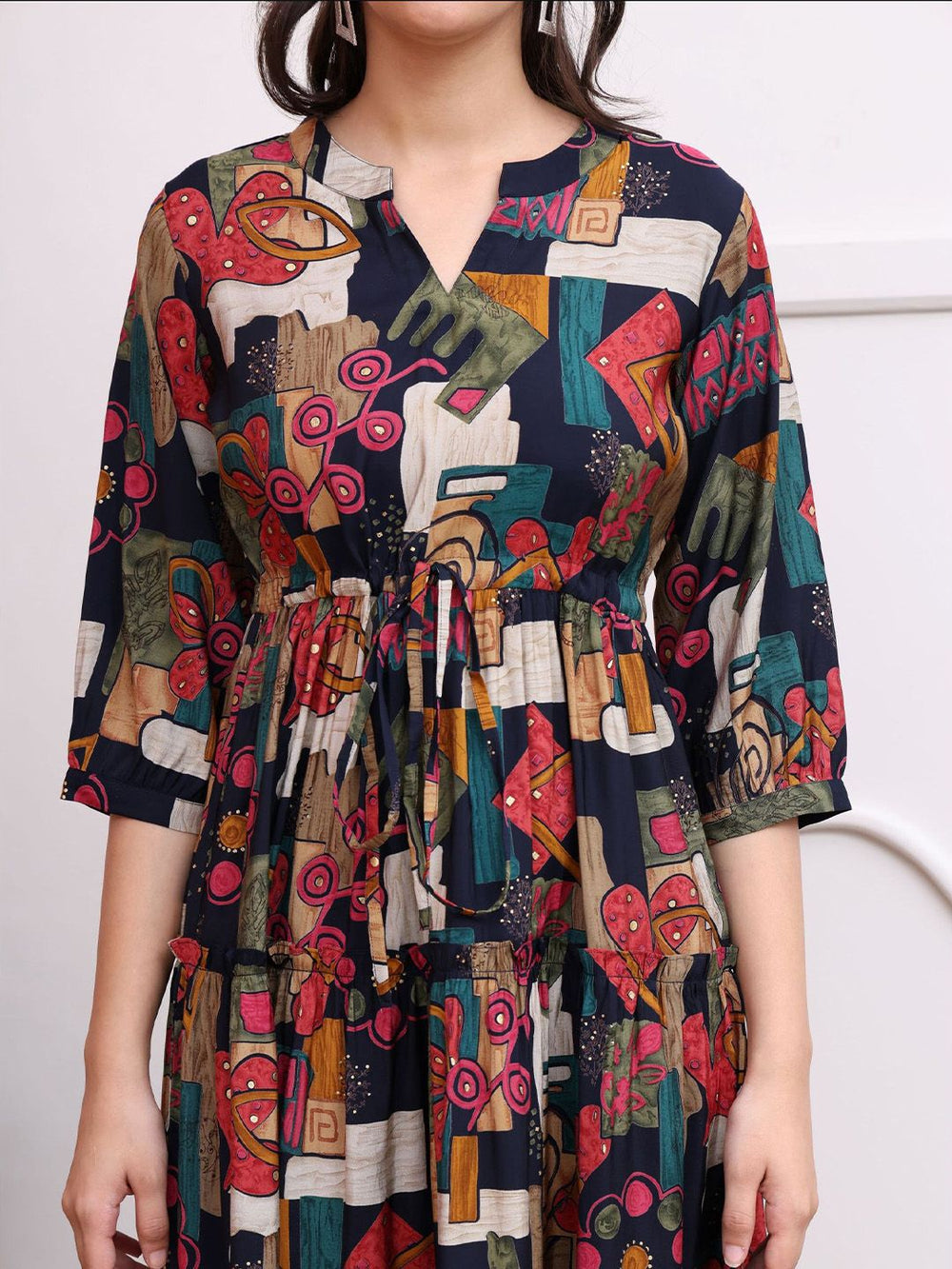 This modern A-line dress features an abstract print and a smart mandarin collar, perfect for contemporary style and comfort.