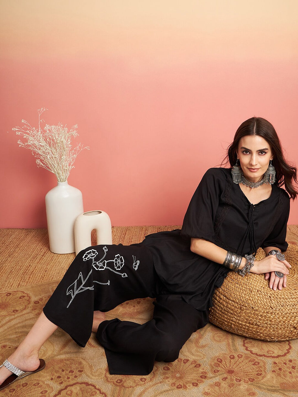 Style: Solid top with lace-up detail paired with embellished palazzo