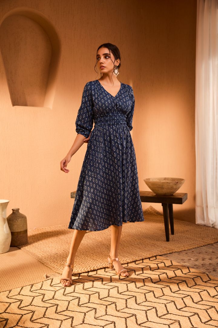 This midi dress features a stylish V-neck and traditional ethnic motifs, crafted in comfortable cotton for a perfect blend of elegance and ease.