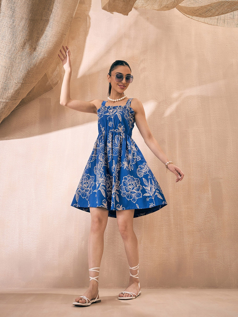 This blue floral fit and flare dress brings a fresh look with a classic square neckline and smocked detailing, designed for stylish comfort.