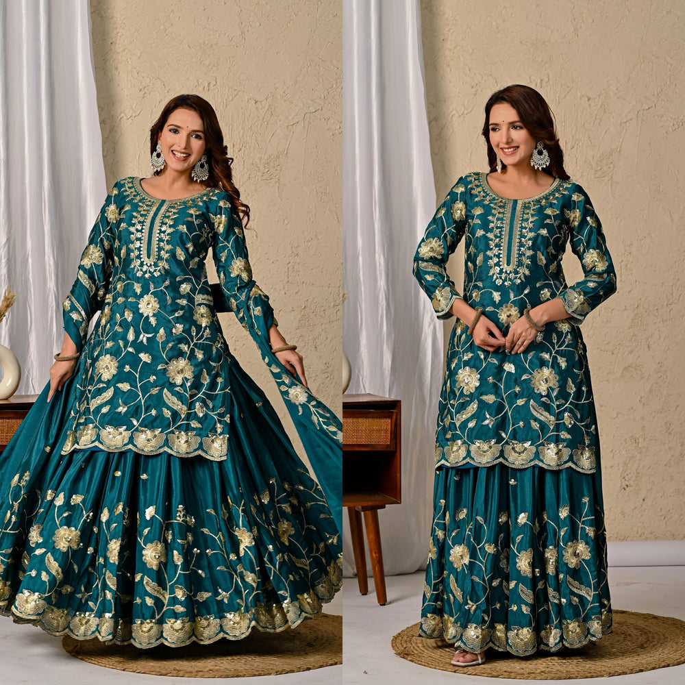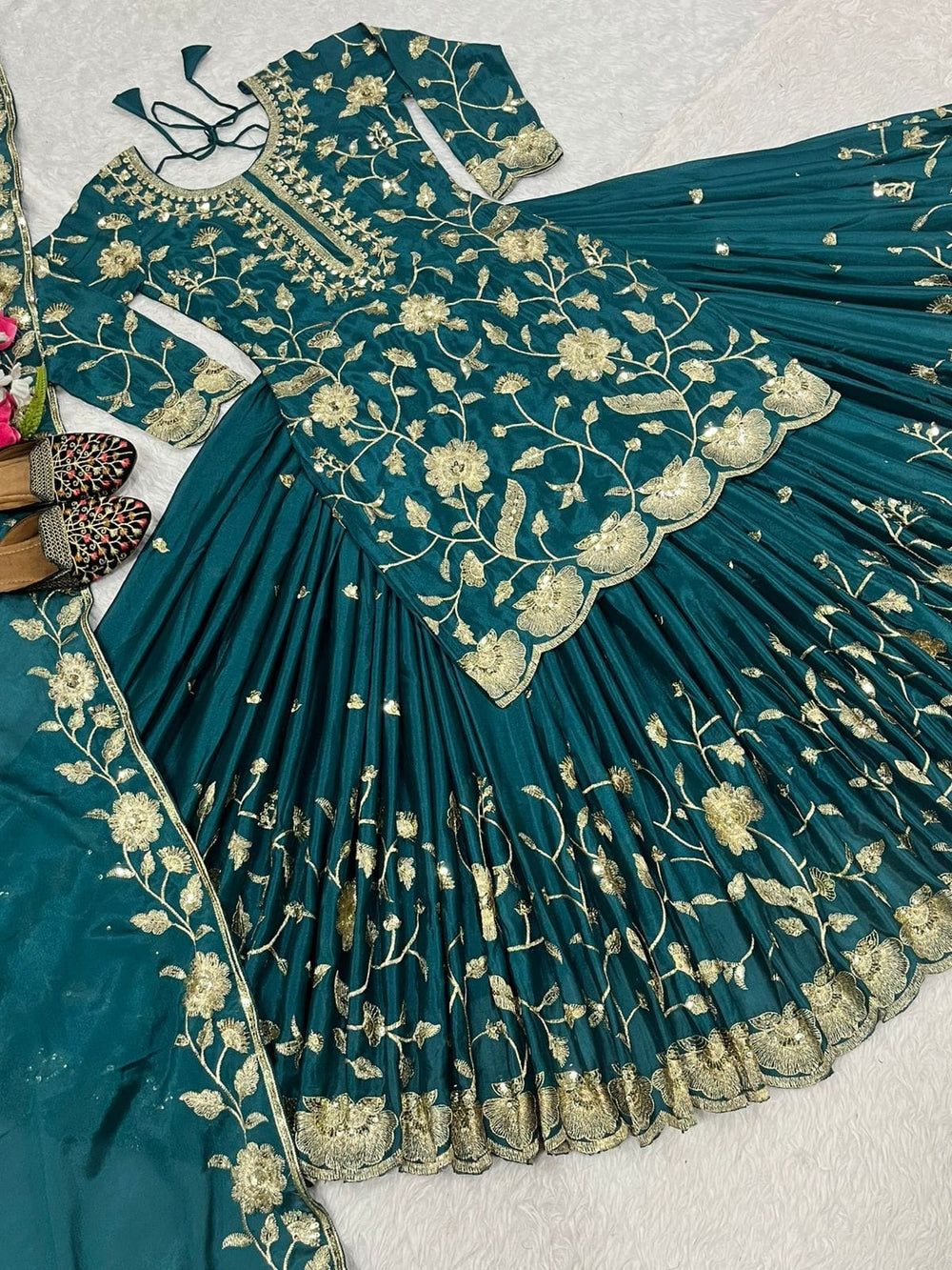 - Lehenga: Heavy chinnon silk with 5mm sequin embroidery; Lining: Micro cotton; Flair: 3 meters