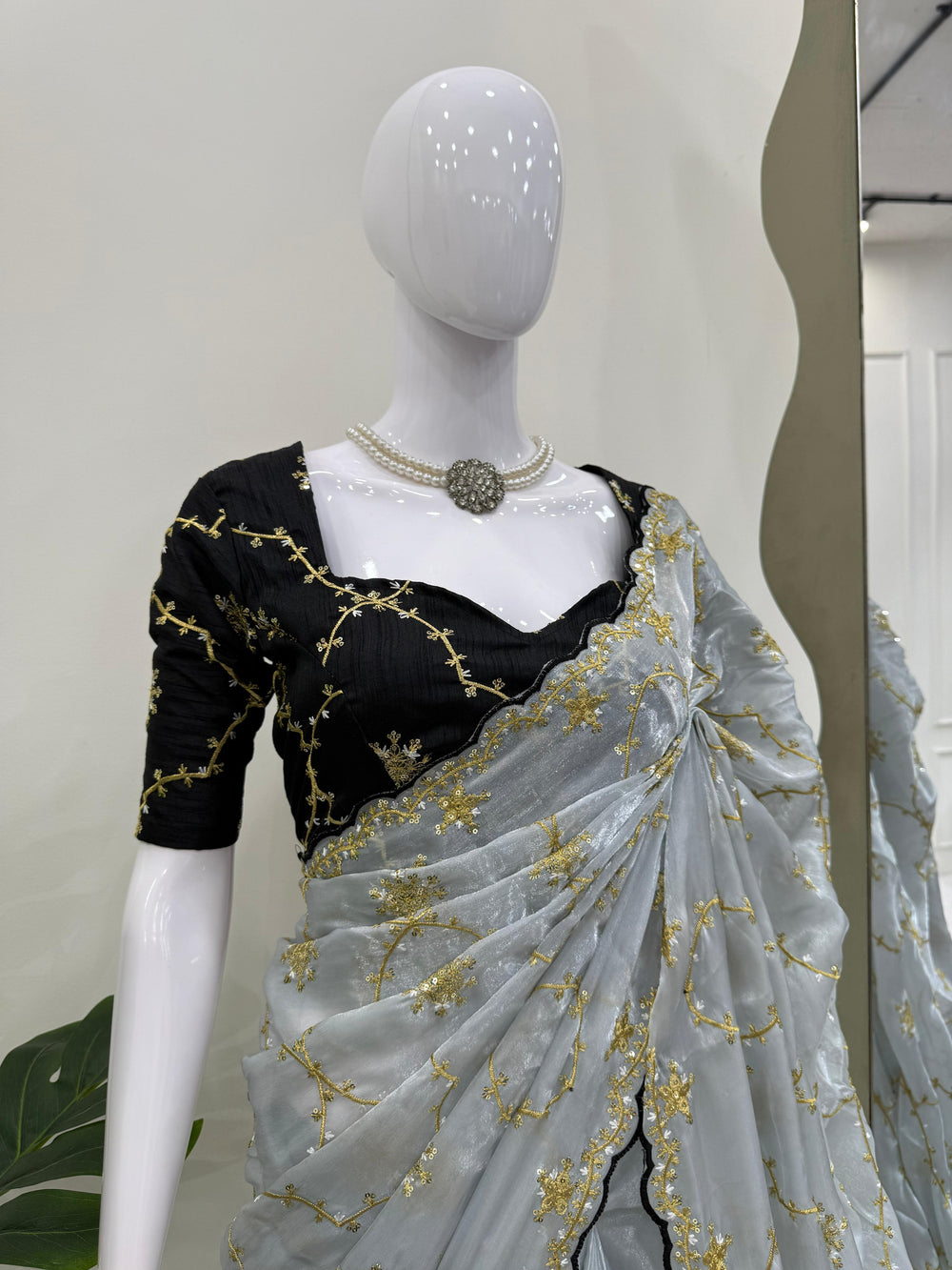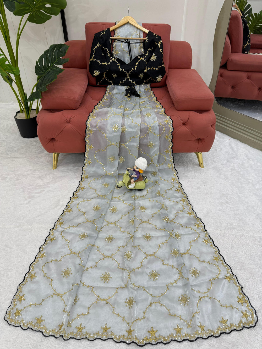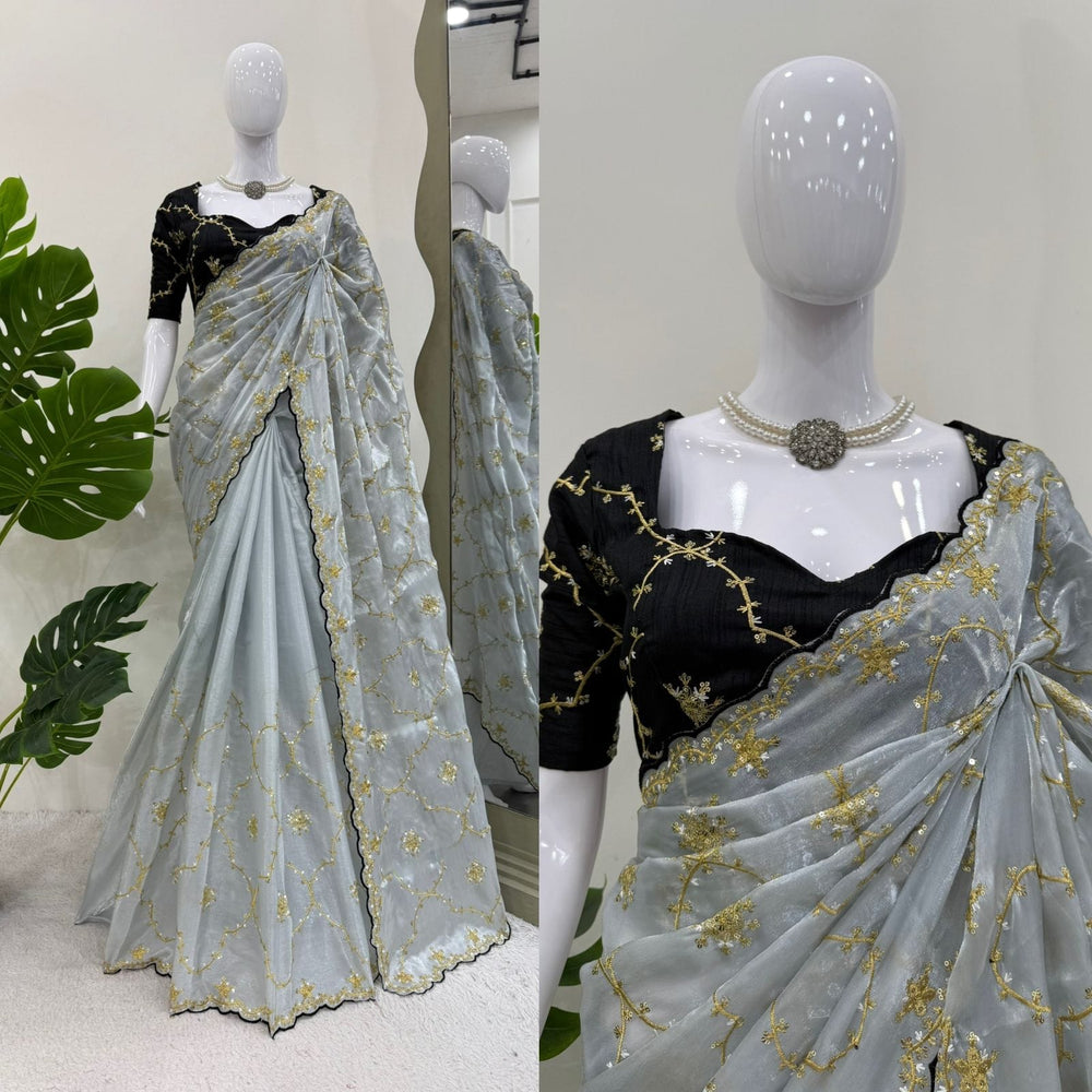 • Ornamentation: Thread and sequin work on saree and blouse (front and back)