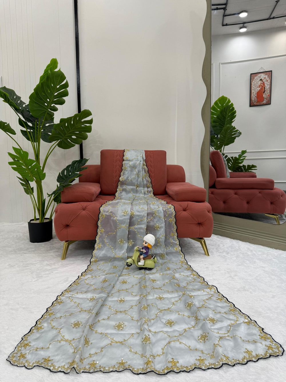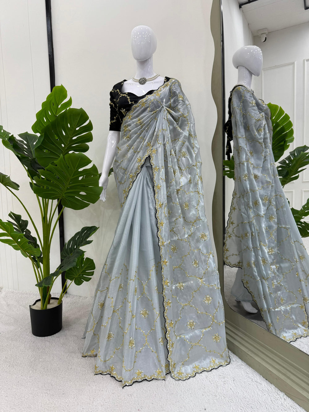 Add elegance to your ethnic collection with this premium saree featuring beautiful thread and sequin work, paired with a richly adorned mono Benglori silk blouse piece.