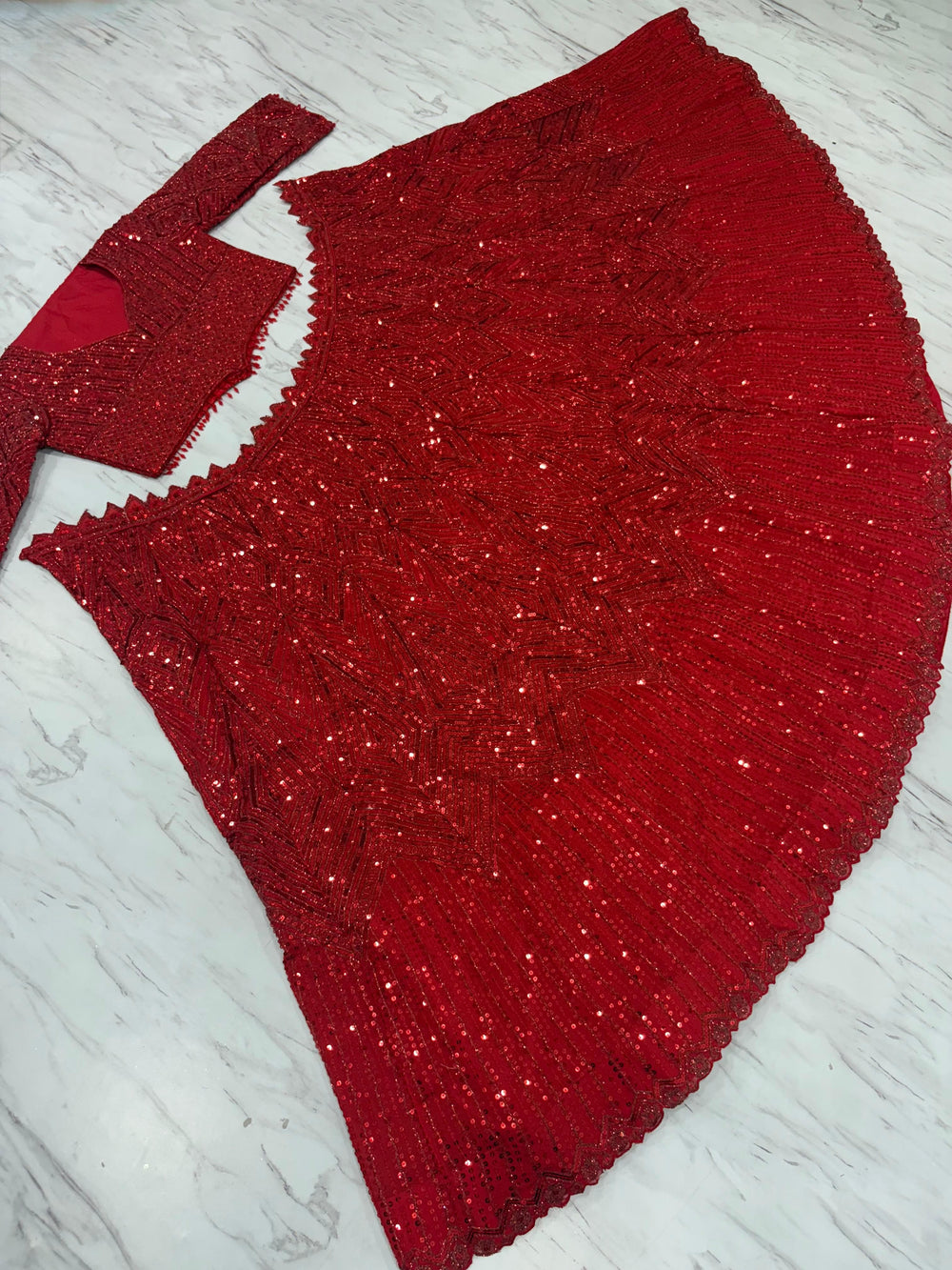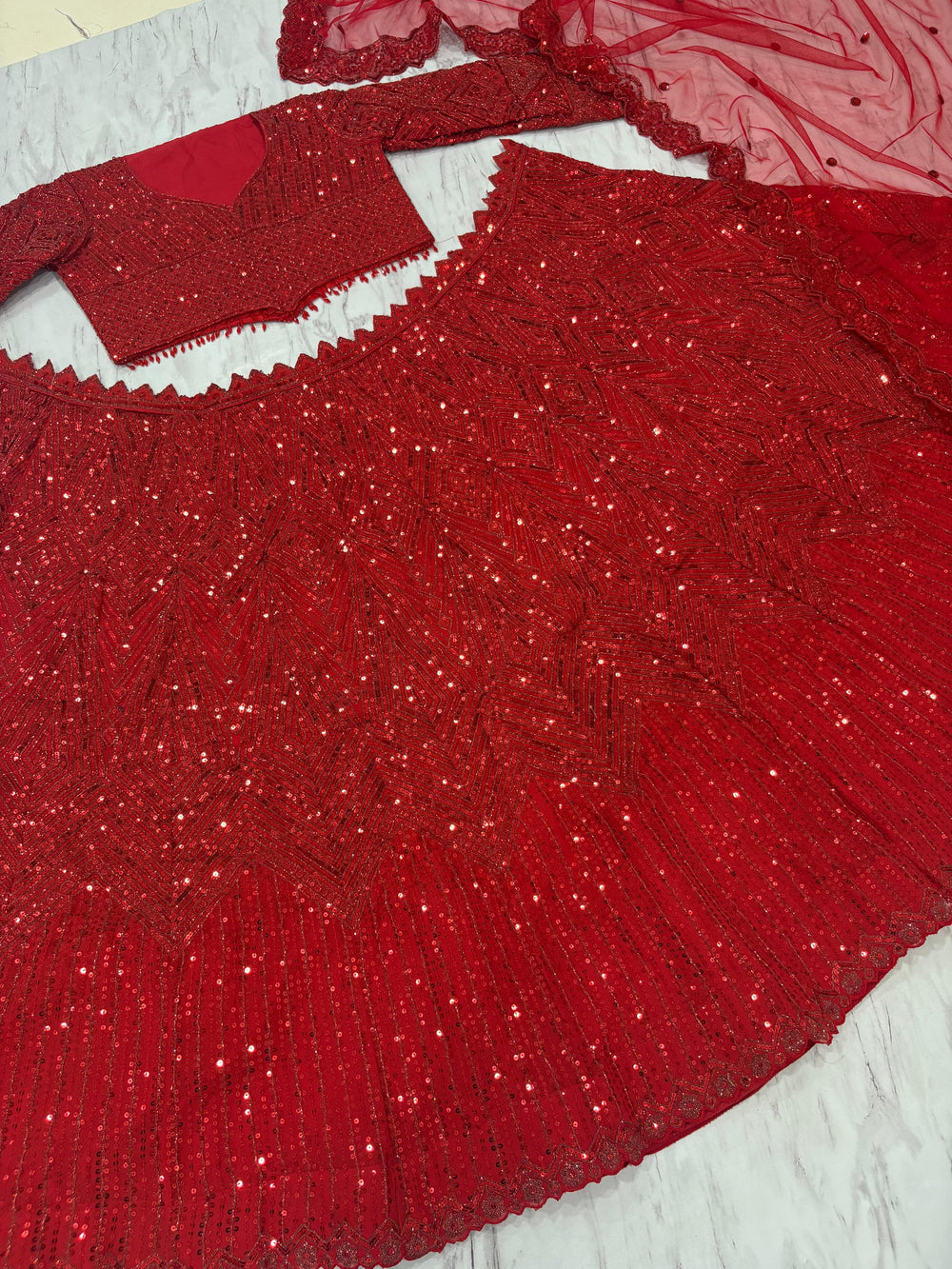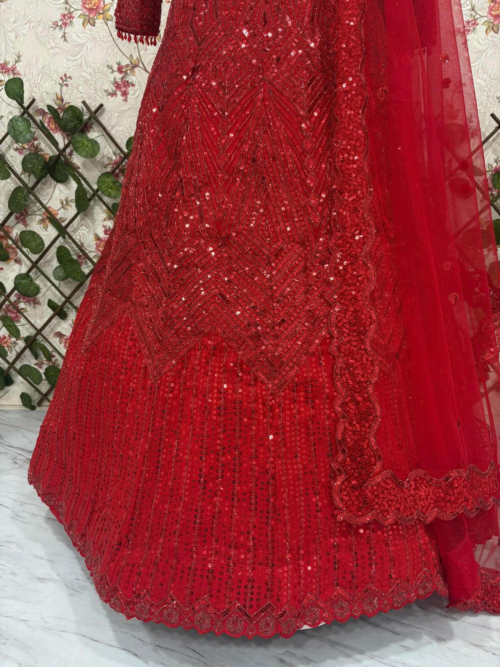 - Dupatta: Premium soft net with thread embroidery, dori work, and heavy sequins