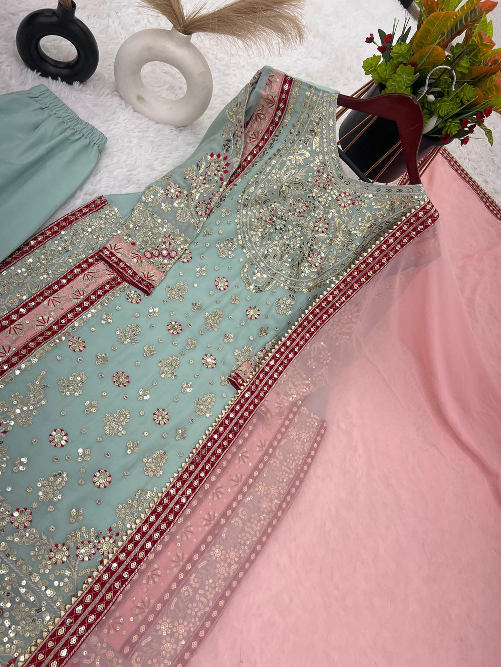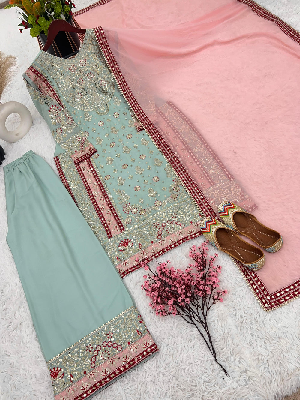Step out in elegance with this fully stitched faux georgette sharara set featuring heavy embroidery and sequin work. Ideal for festive occasions and celebrations.