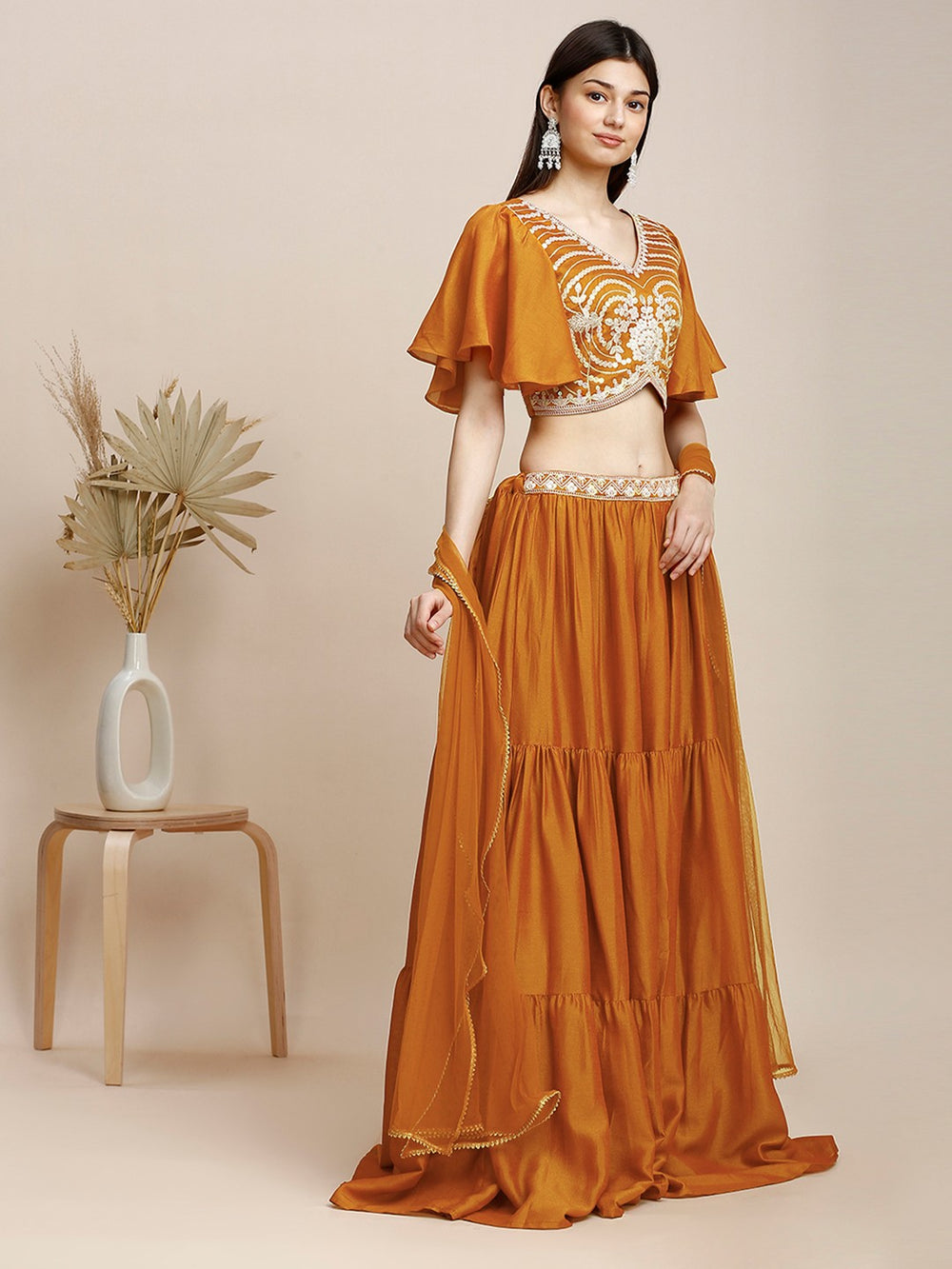Style: Embroidered lehenga choli set with V-neck blouse