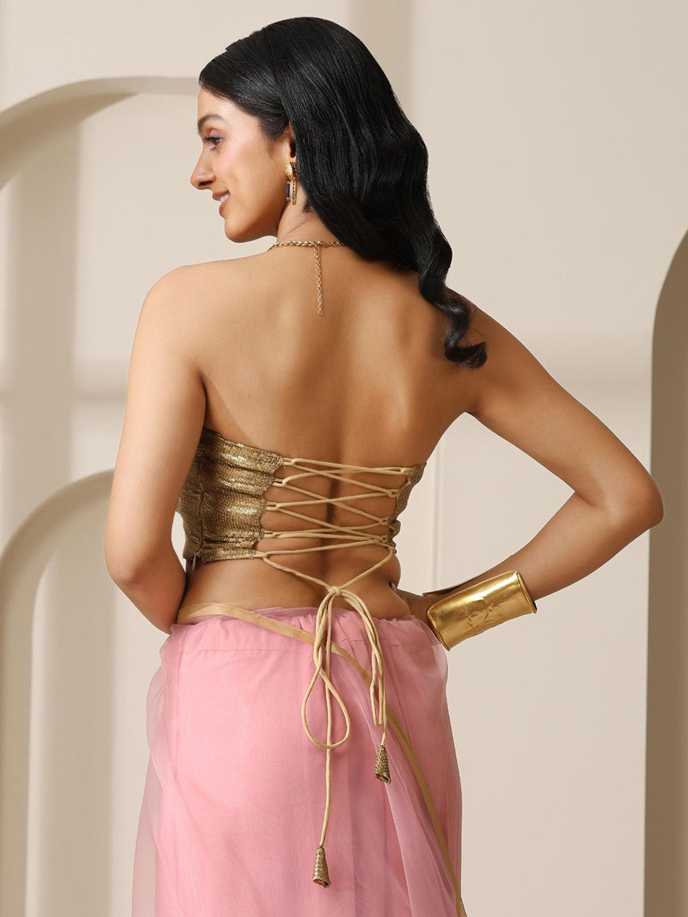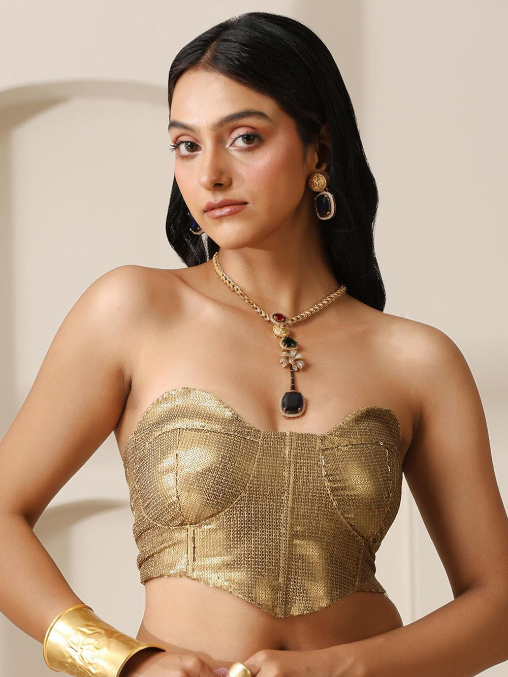 Add a touch of glam to your saree looks with this beautifully sequinned blouse, featuring a modern strapless design and shimmering embellishments.