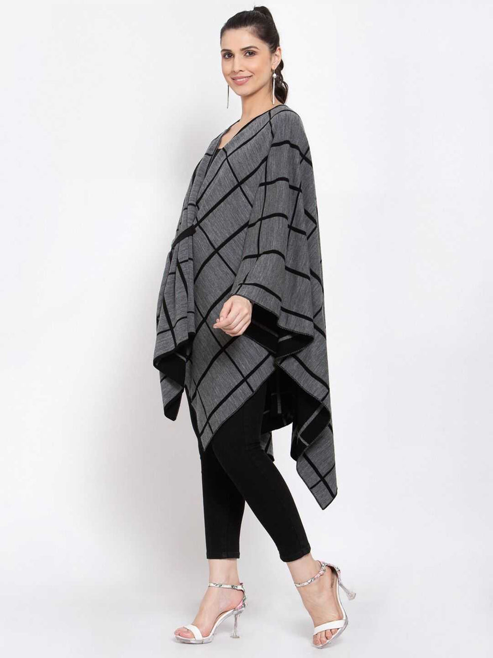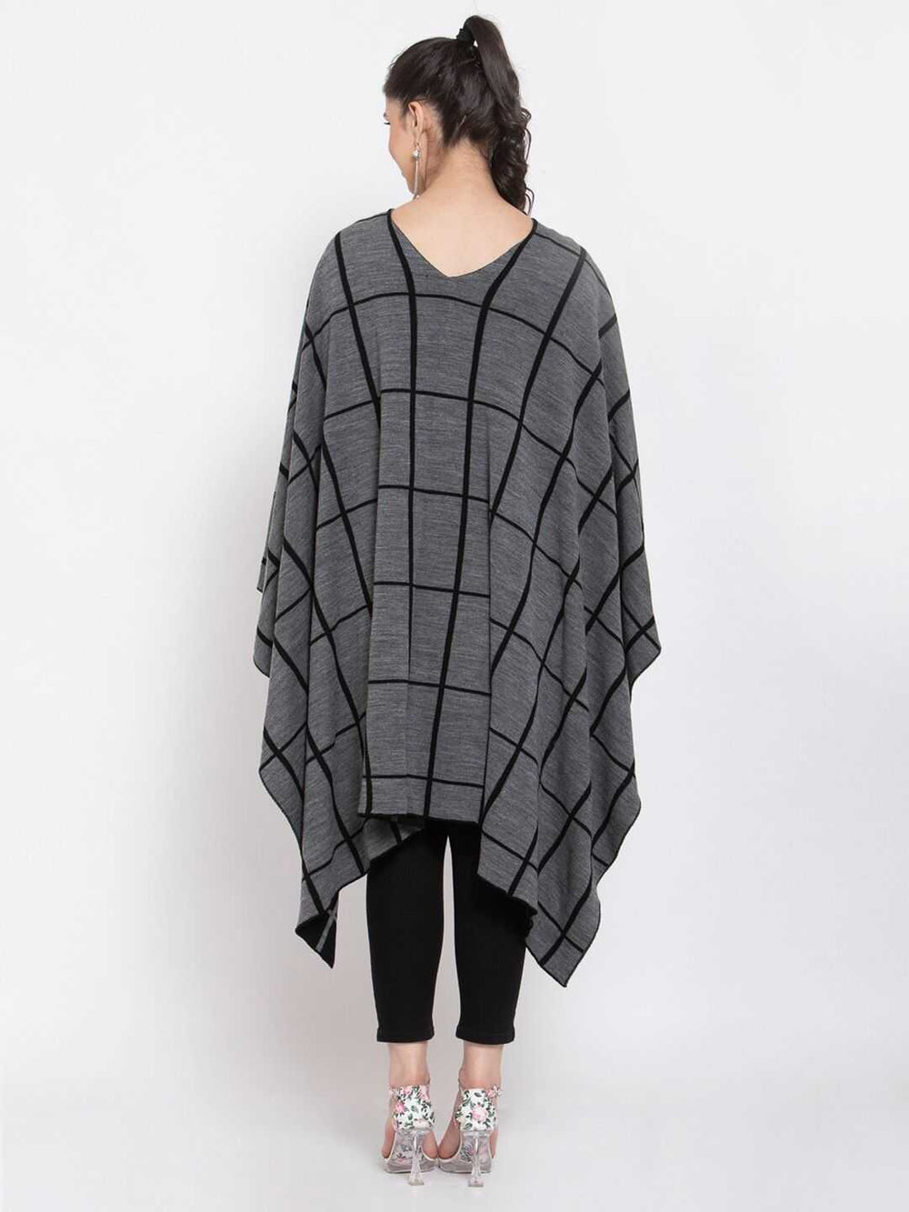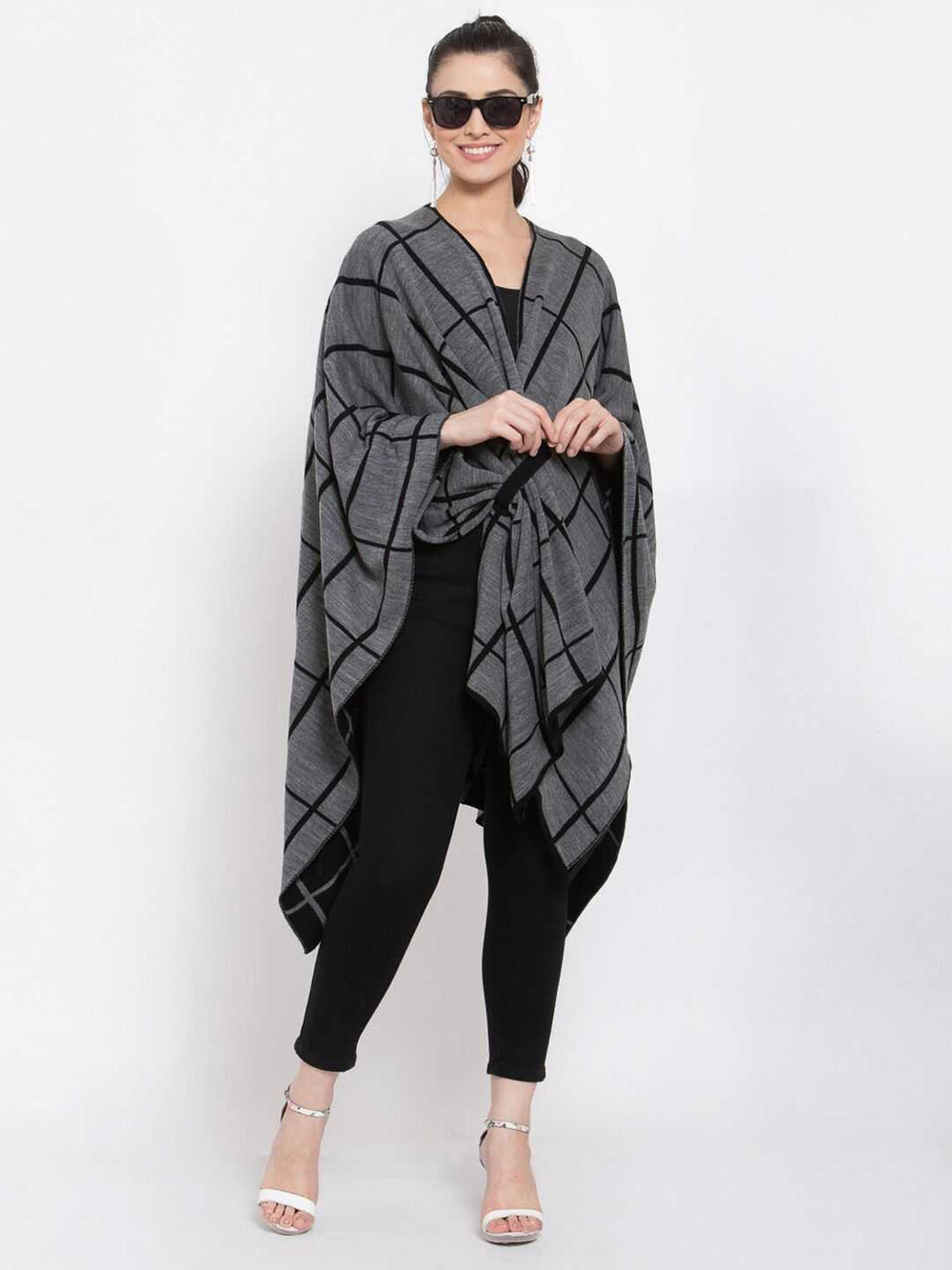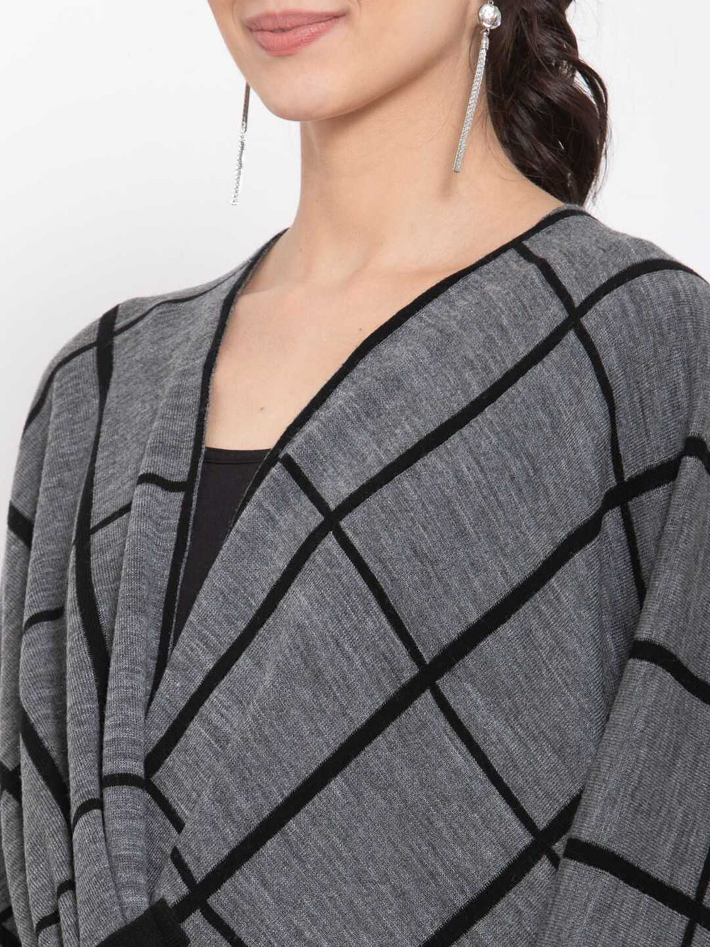 • Style: Checked open front shrug with an asymmetric hem