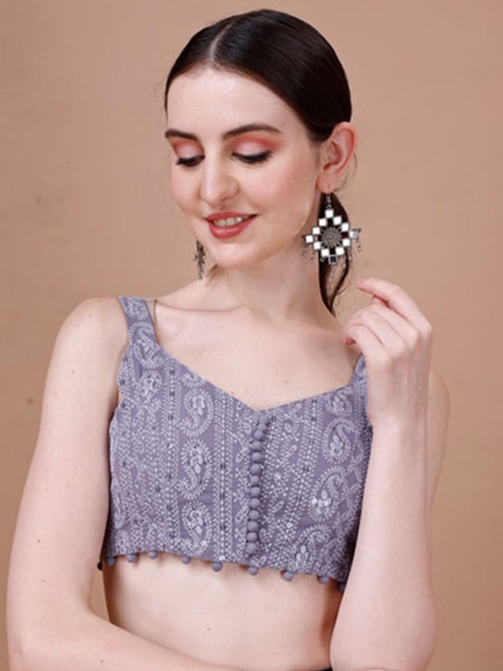 Elevate your ethnic look with this grey georgette embroidered blouse, featuring a V-neck and tie-up detail for contemporary style.