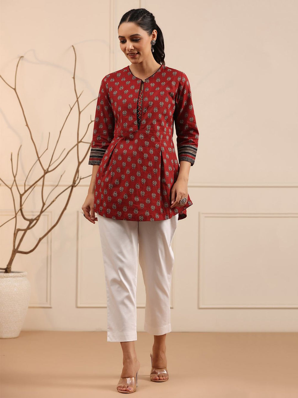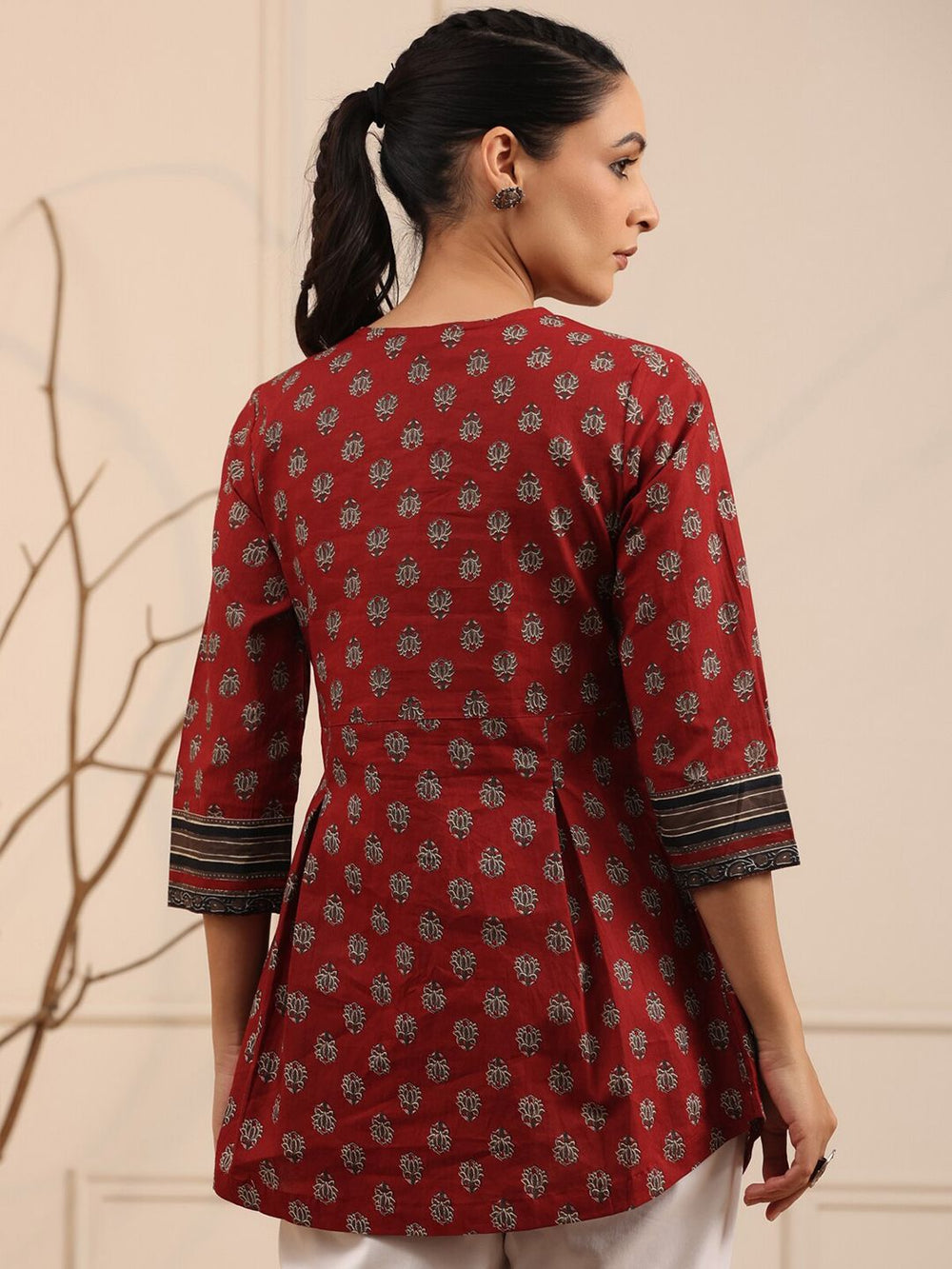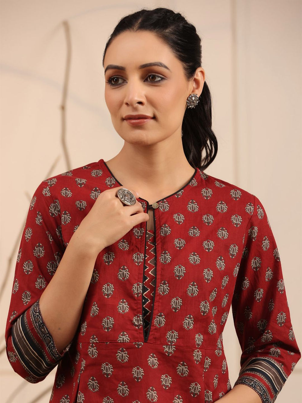 Elevate your wardrobe with this elegant maroon and black pure cotton kurti featuring ethnic motif prints and a flattering keyhole neckline, perfect for everyday comfort.
