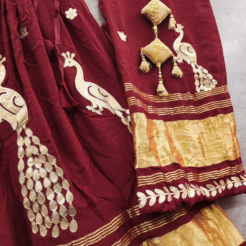 This maroon modal gajji silk lehenga set features classic gota work for an elegant wedding look. The fully stitched flared lehenga is paired with a beautifully decorated dupatta and an unstitched blouse piece.