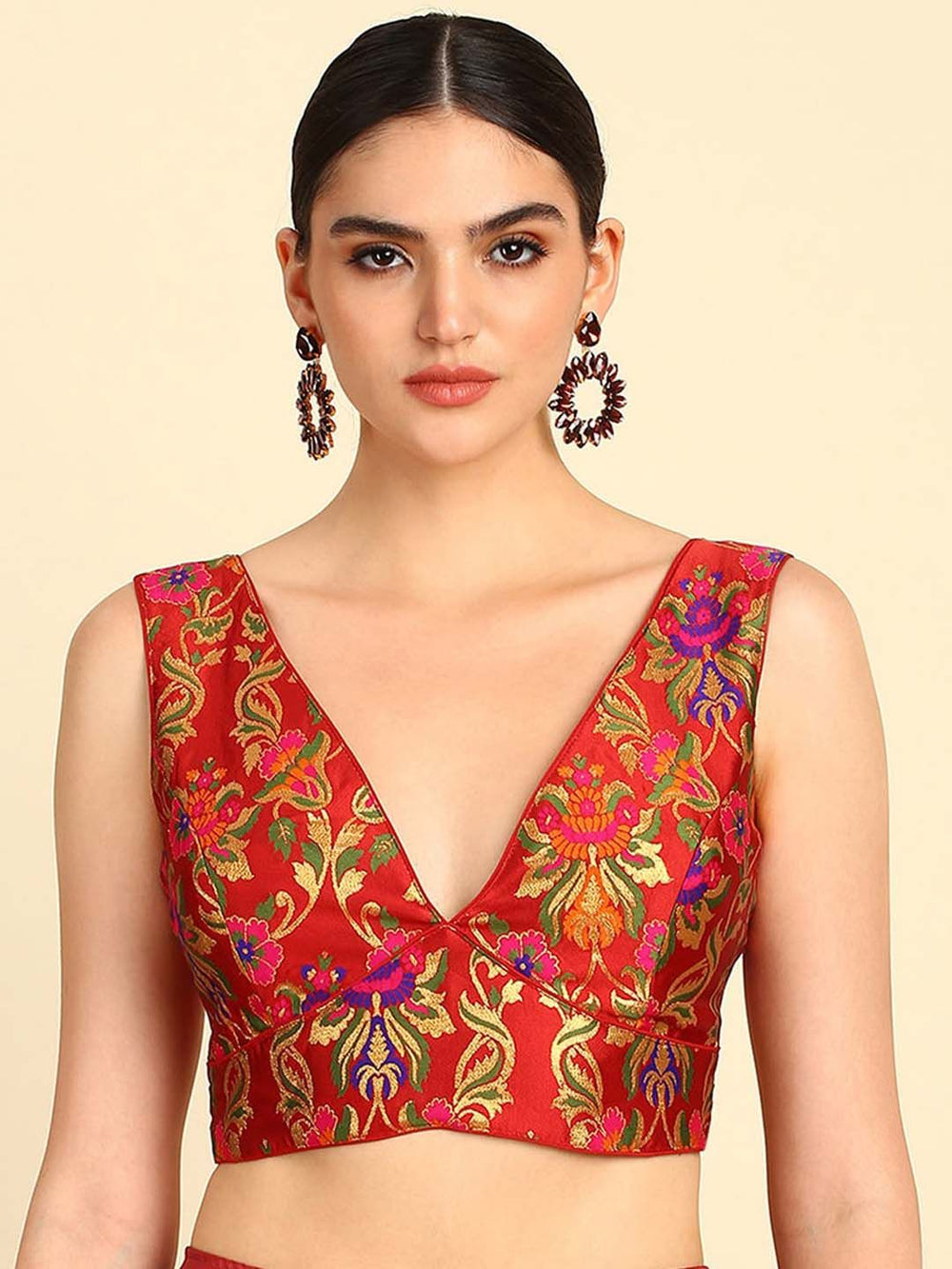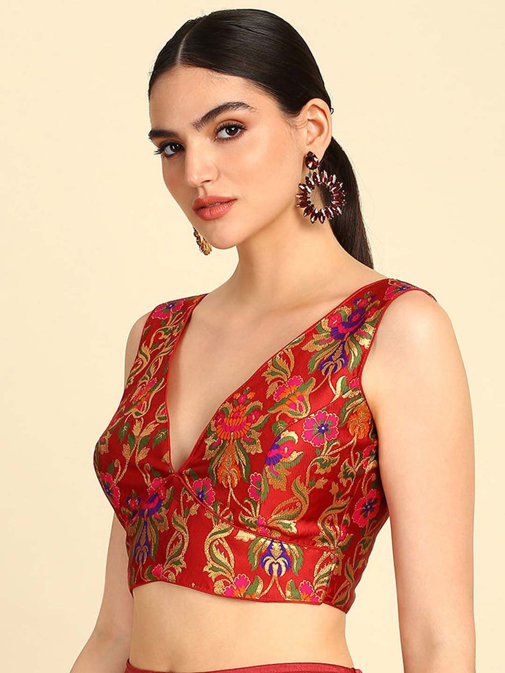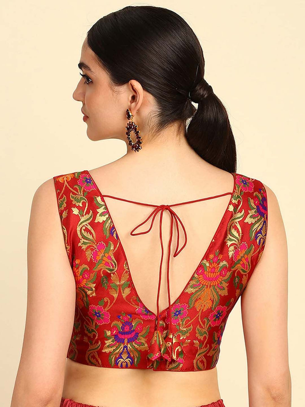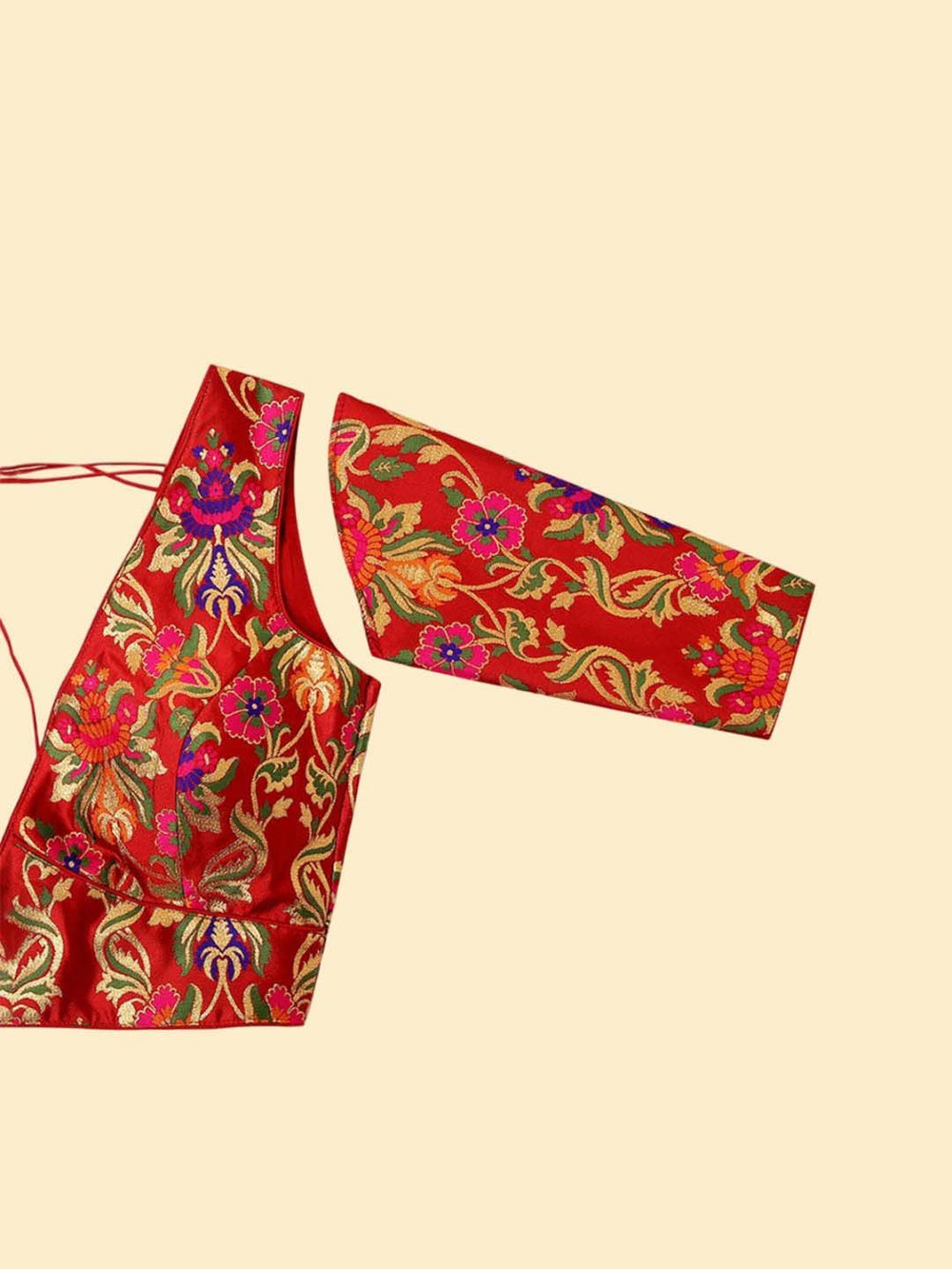 A stylish fusion wear blouse crafted from a silk blend with intricate woven design and functional tie-up detail, perfect for elegant occasions.