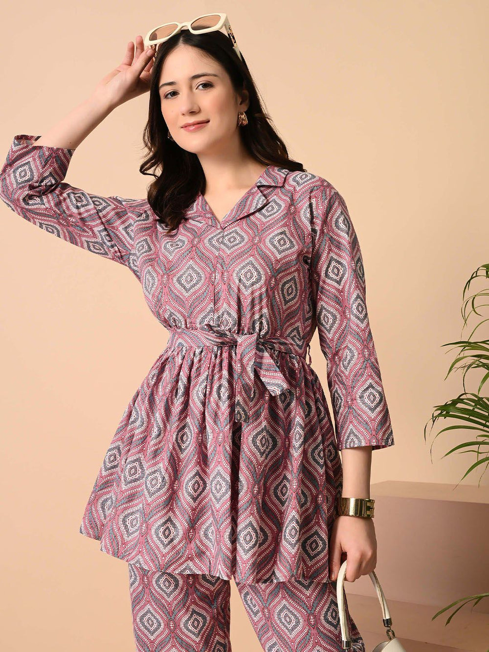 Elevate your look with this mauve printed co-ord set crafted from viscose rayon. The set includes a stylish top and matching trousers, perfect for party occasions.