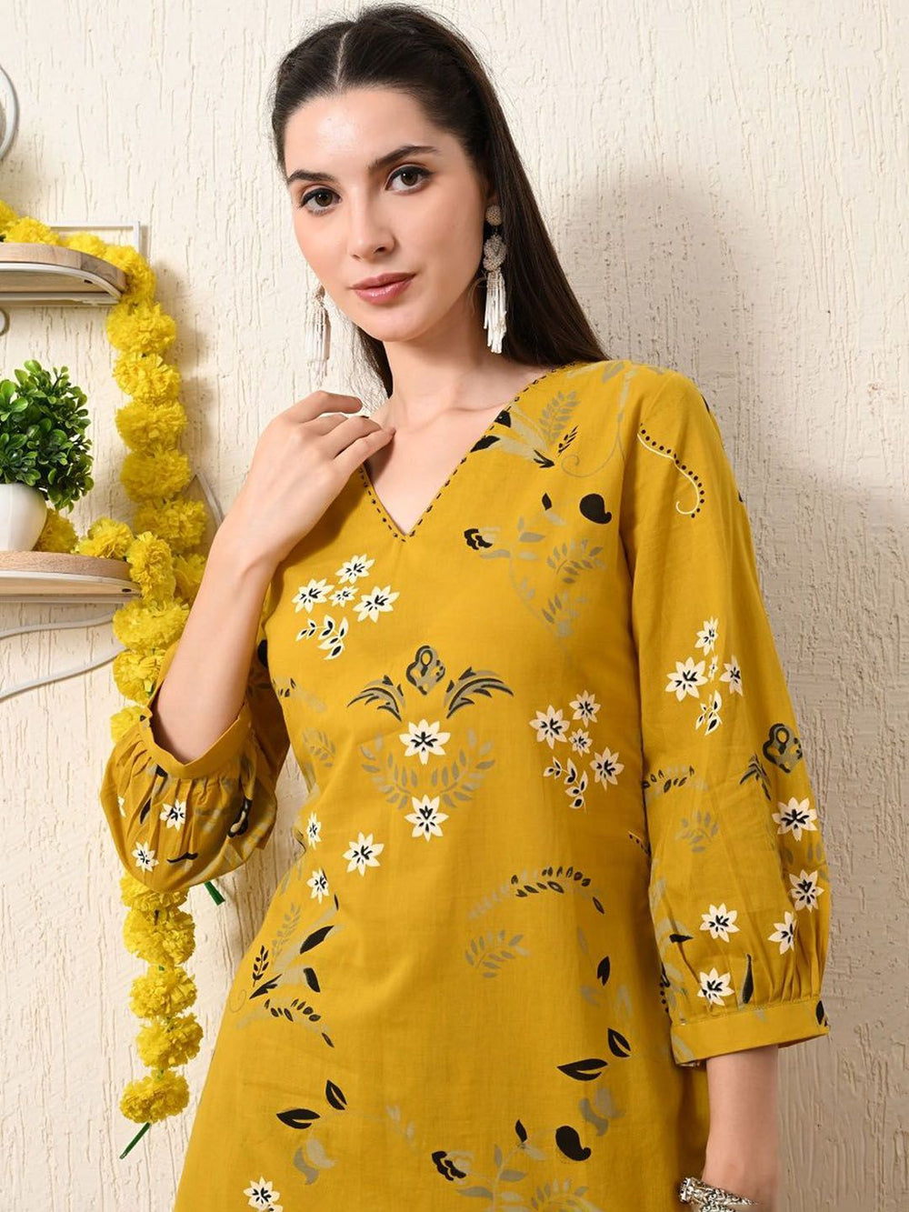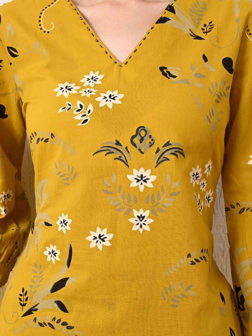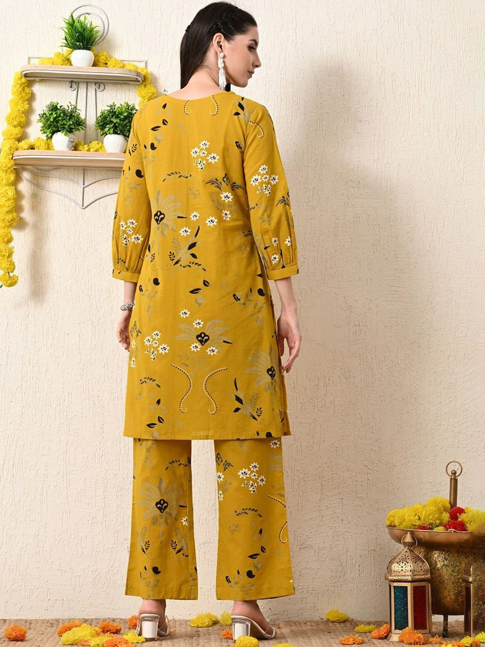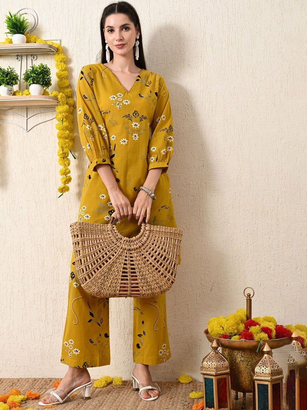Elevate your casual wardrobe with this stylish mustard printed co-ord set including a V-neck top and matching palazzos.