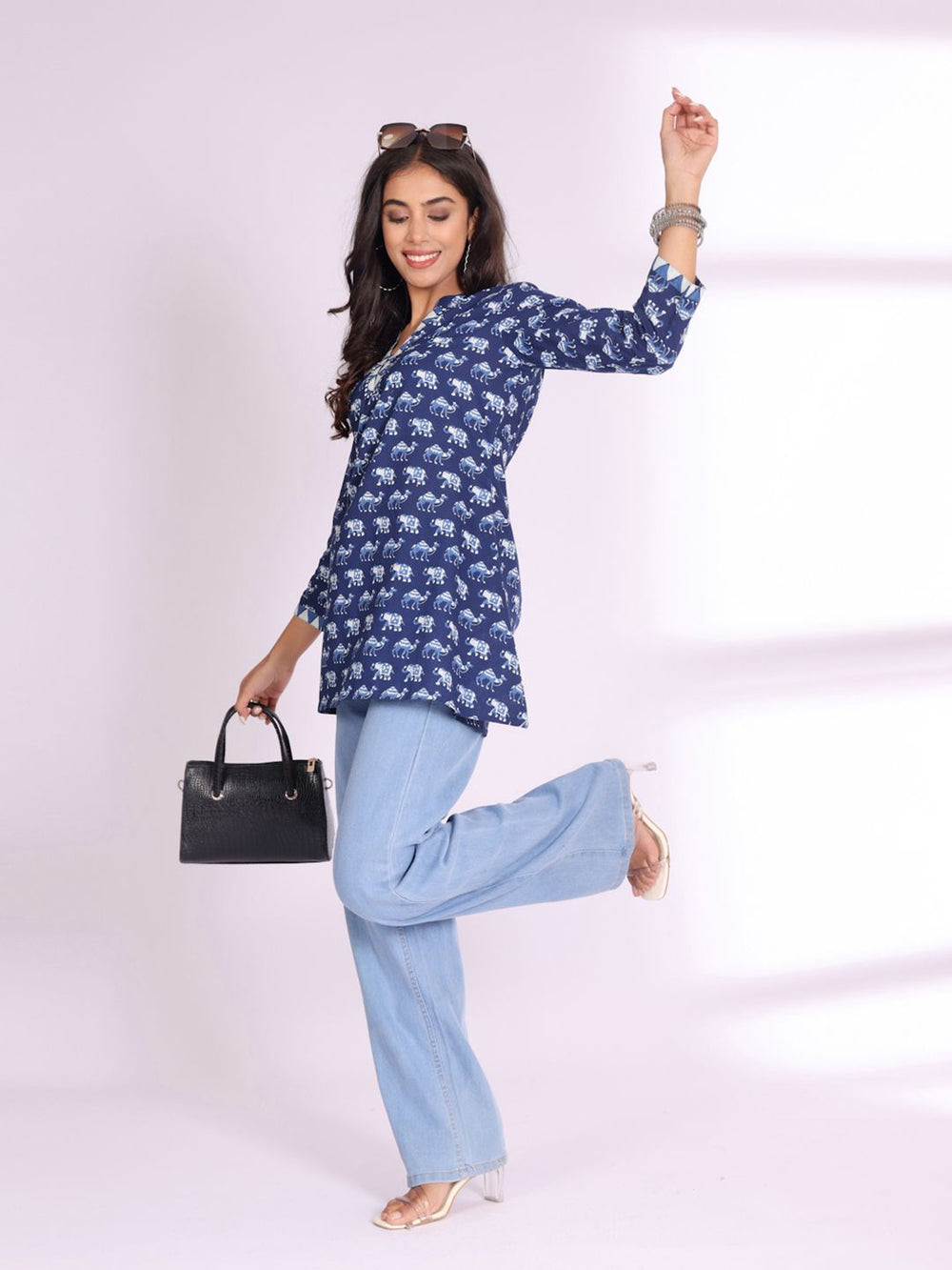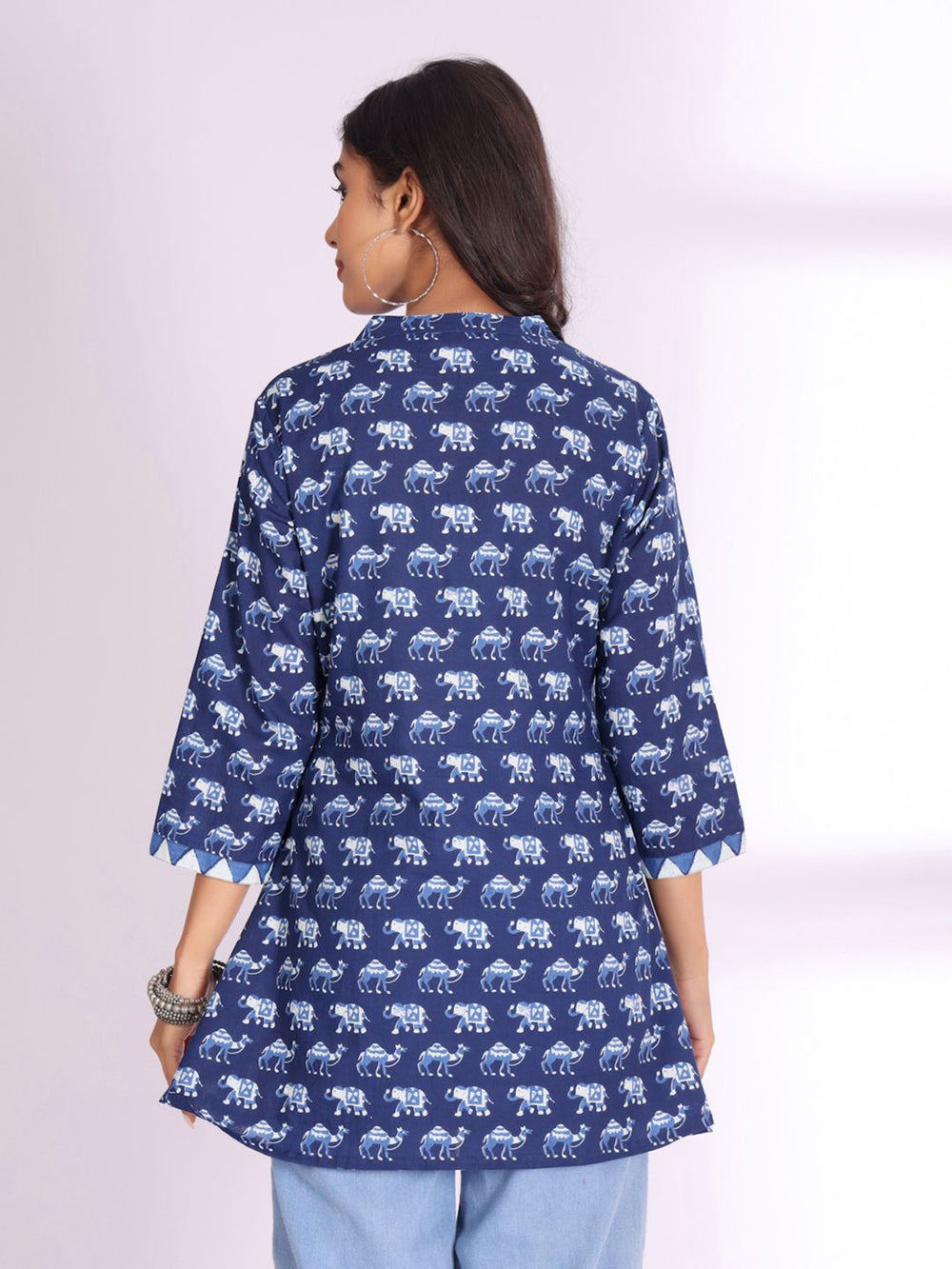 Elevate your daily style with this printed A-line kurti, crafted in soft cotton with ethnic motifs and a comfortable notch neckline.