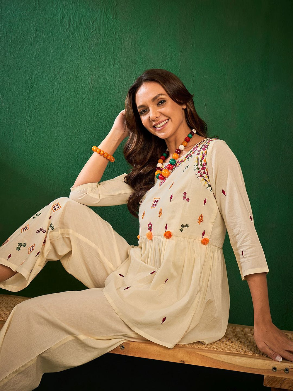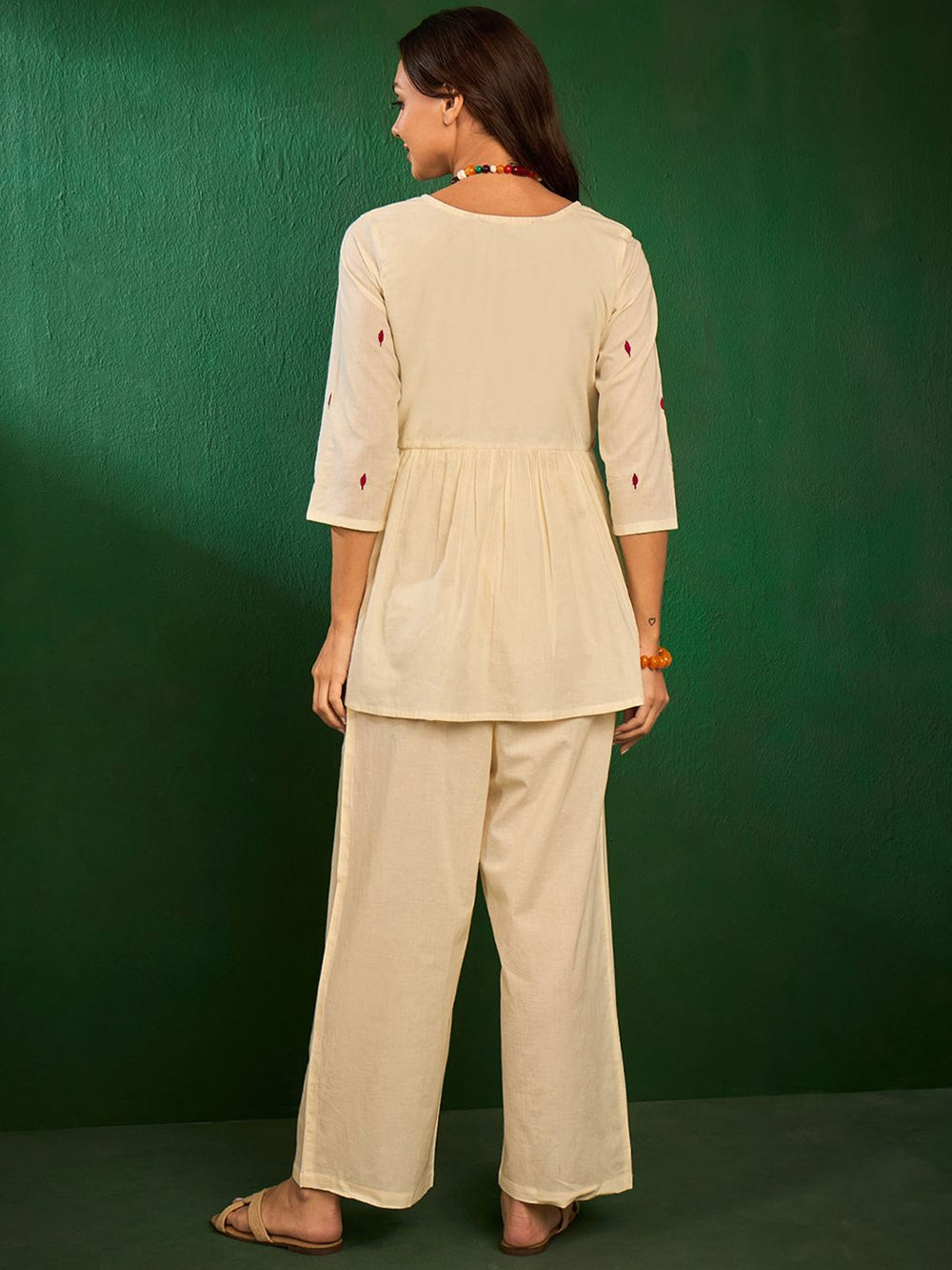 Add a touch of elegance to your wardrobe with this off white embroidered pure cotton co-ord set, perfect for party occasions and comfortable all day wear.