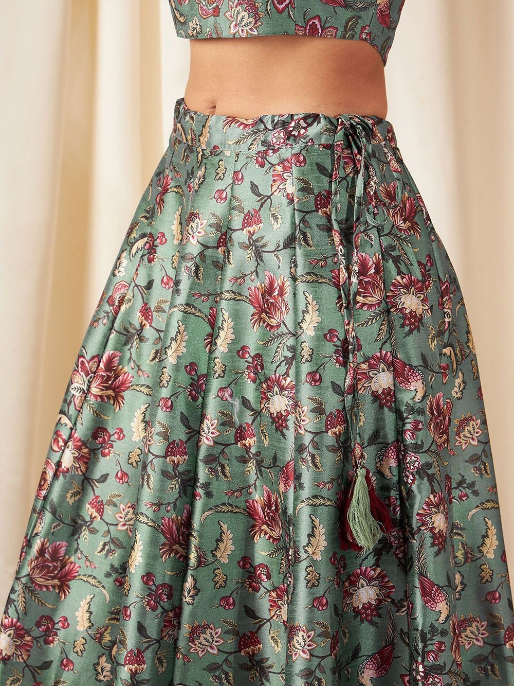 Effortlessly stylish, this olive green and pink poly silk lehenga set features a floral print and a modern sleeveless crop top. Perfect for any festive celebration.