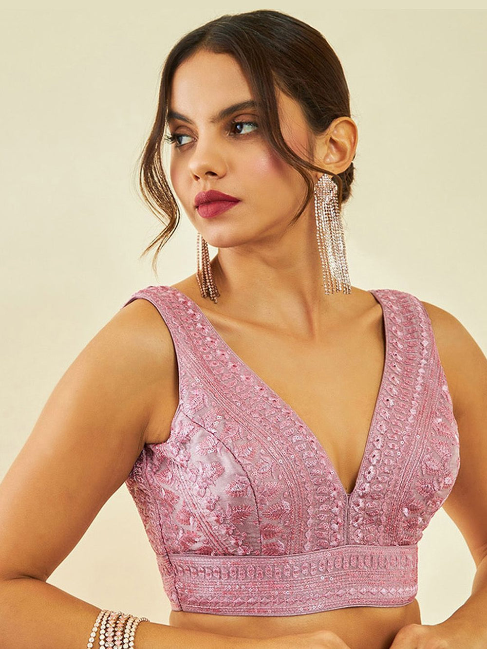 Elevate your saree attire with this chic onion pink viscose rayon blouse, featuring a flattering V-neck and delicate sequin embellishments.