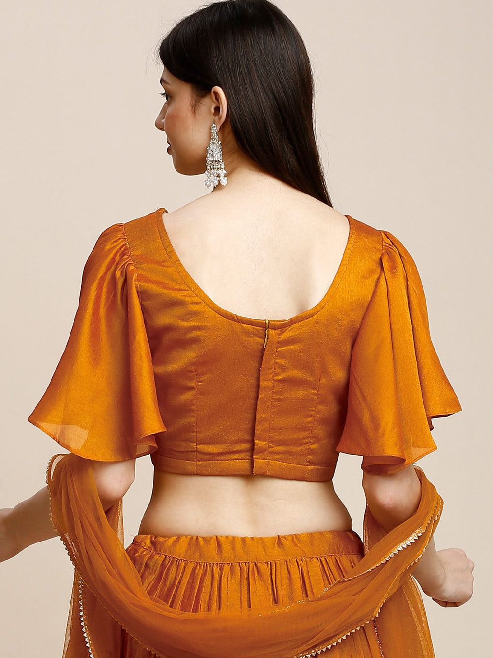 Step out in elegance with this orange and gold lehenga set, crafted in luxurious poly silk and adorned with delicate embroidery. Complete with a pure silk blouse and a matching solid dupatta, this ready-to-wear ensemble brings festive flair to any occasion.