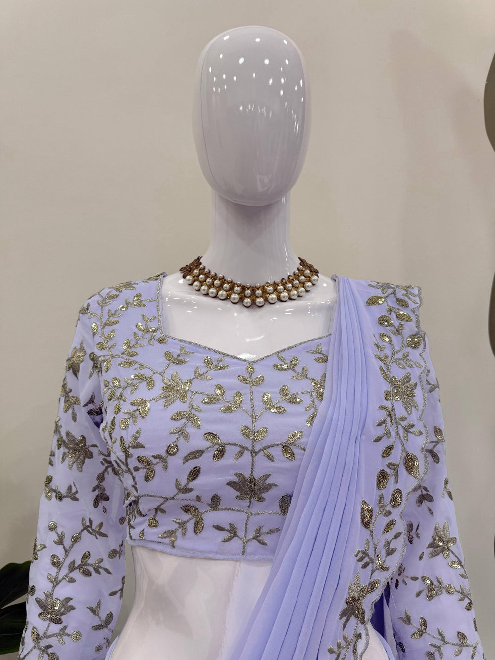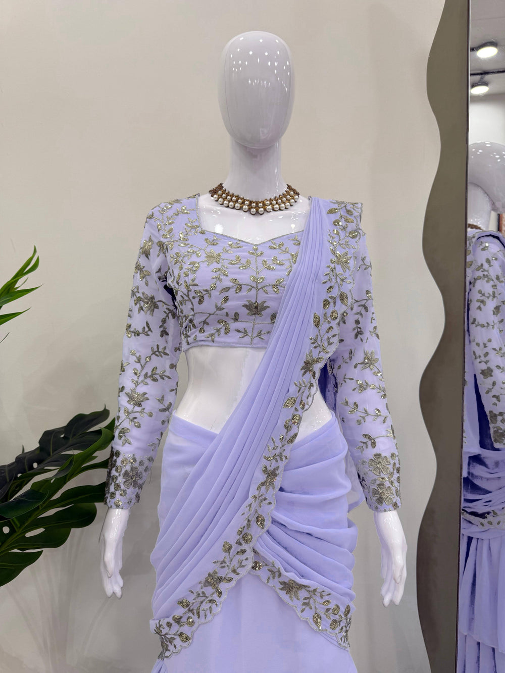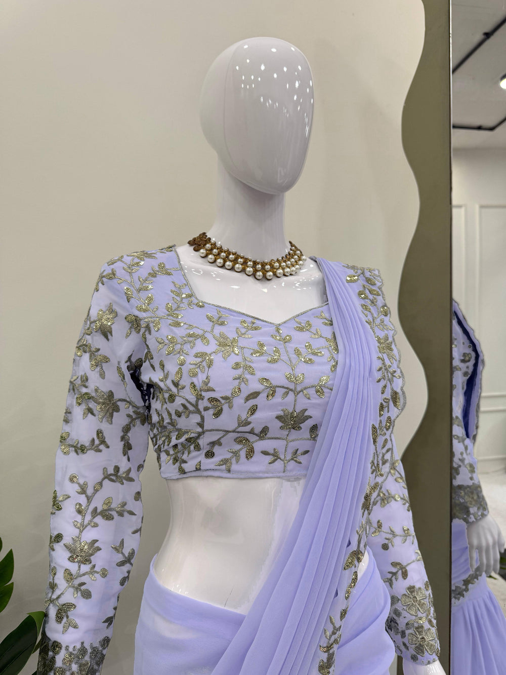 Elevate your festive wardrobe with this ready-to-wear pastel purple lehenga saree, beautifully adorned with ornamental thread and sequin work on soft faux georgette for a graceful look.