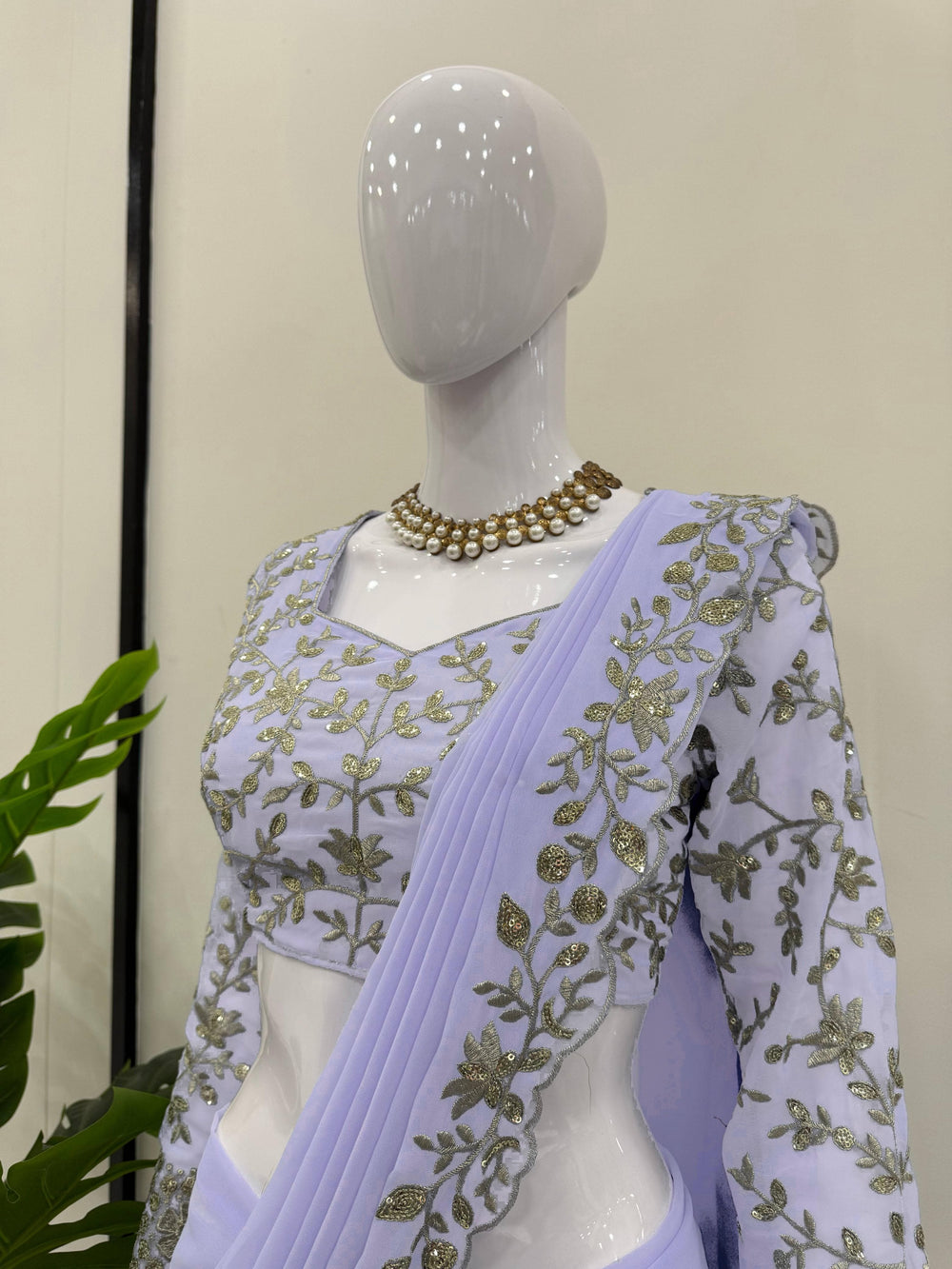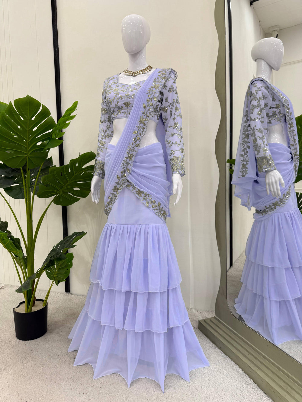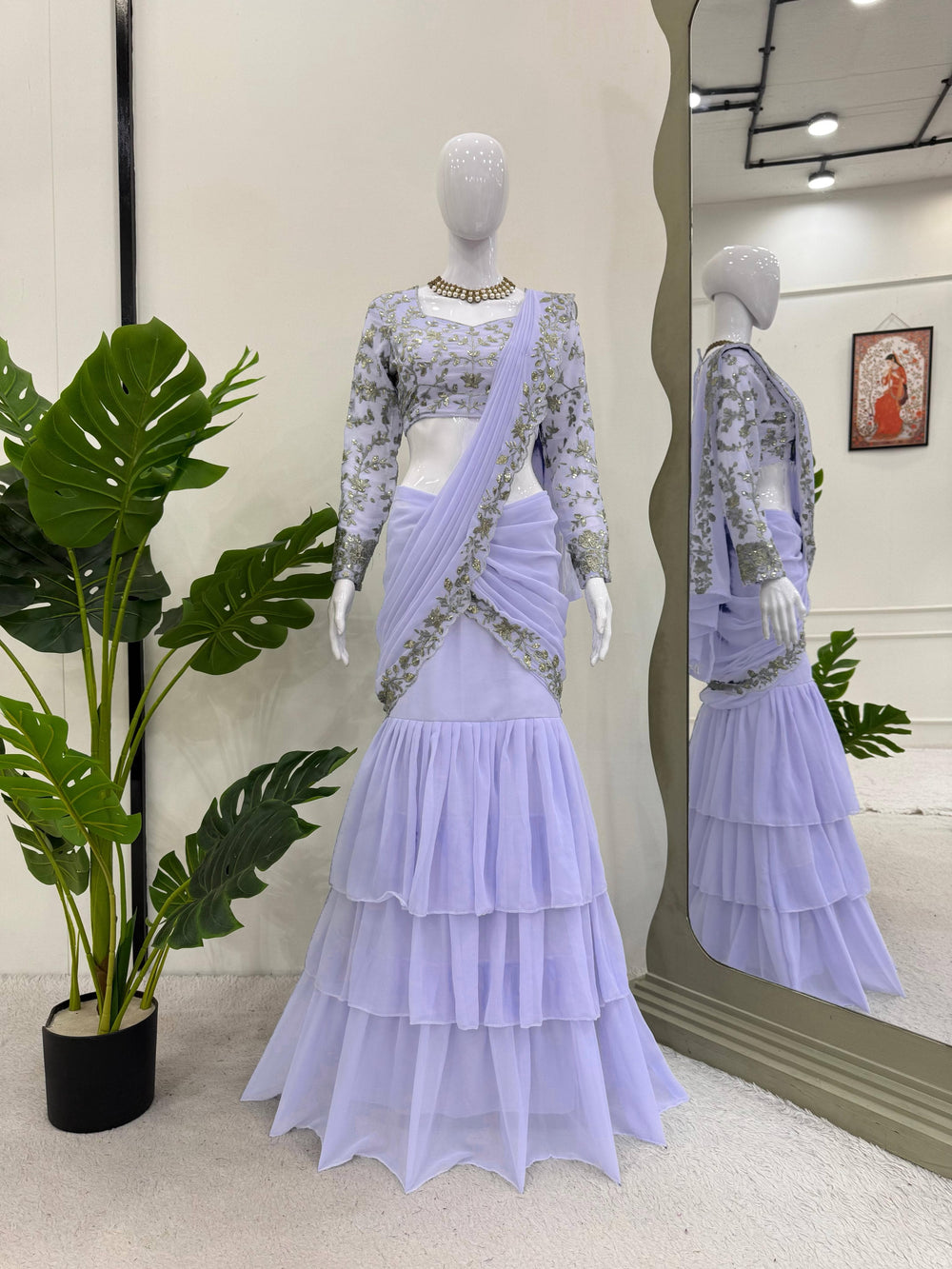Elevate your festive wardrobe with this ready-to-wear pastel purple lehenga saree, beautifully adorned with ornamental thread and sequin work on soft faux georgette for a graceful look.