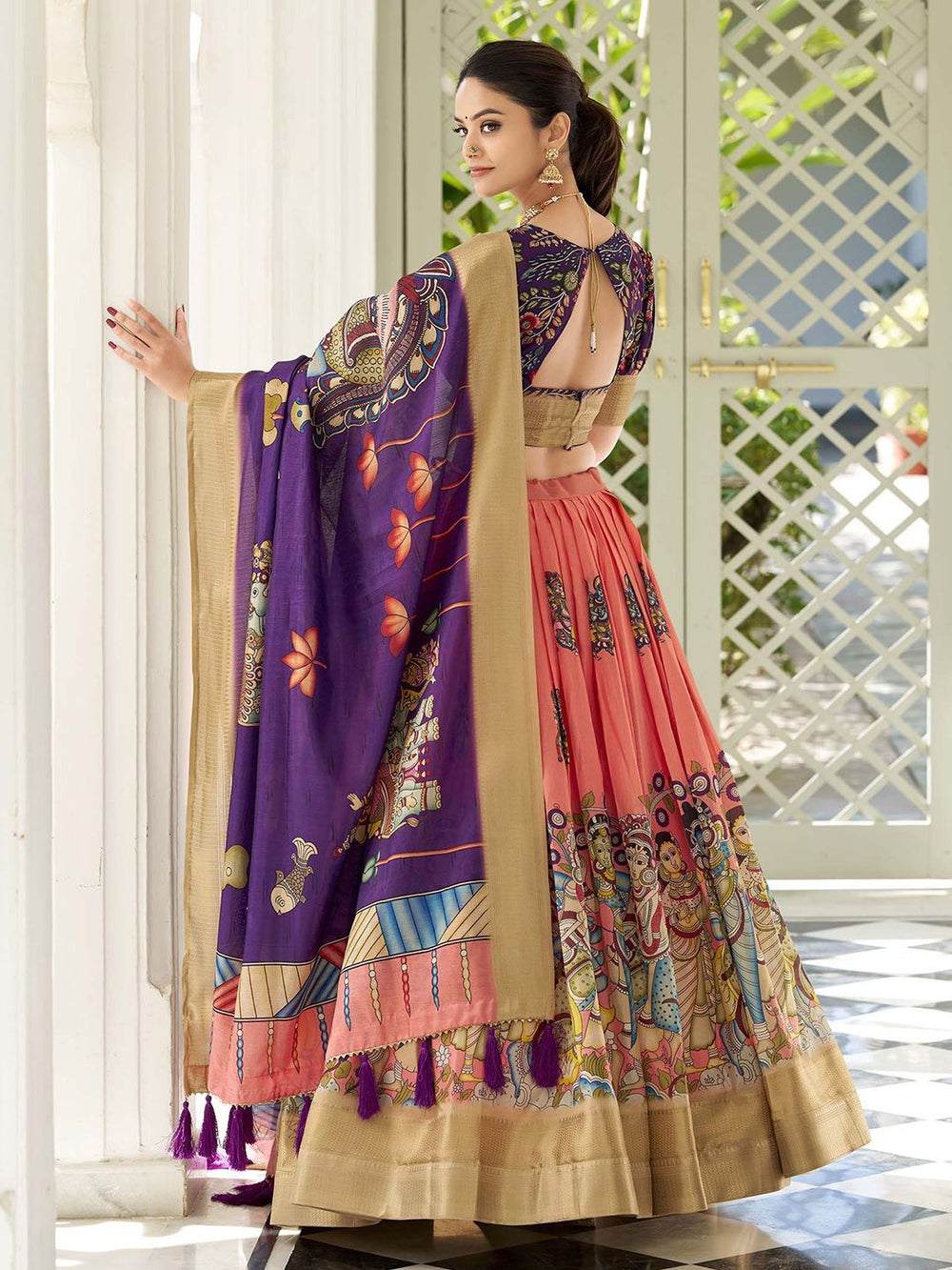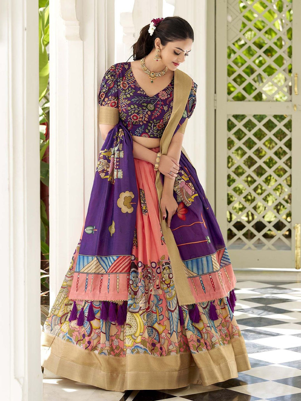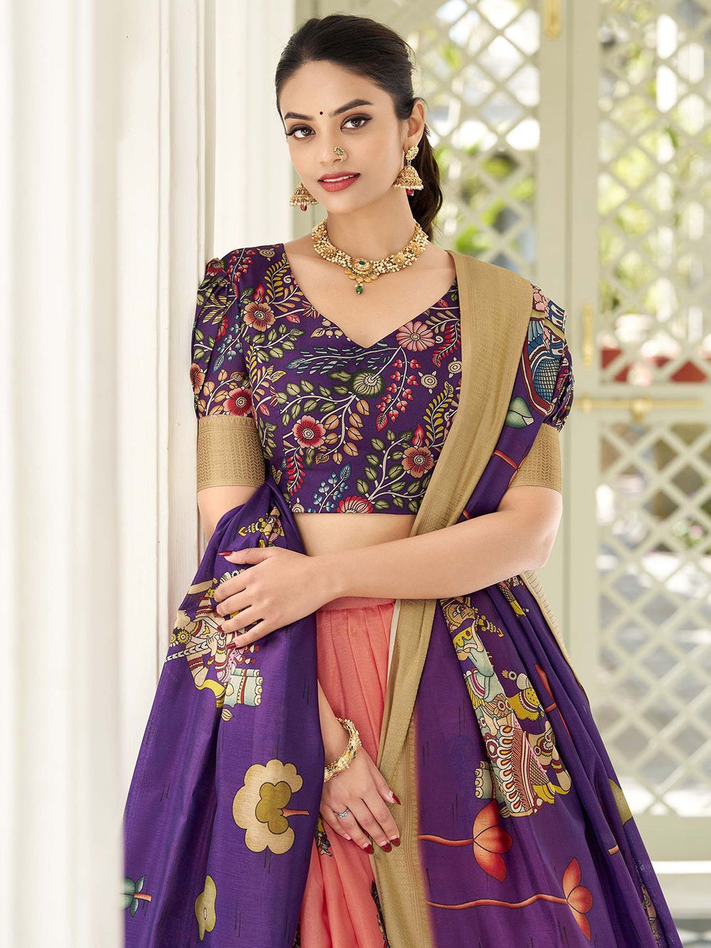 This elegant lehenga set showcases vibrant kalamkari print in peach and purple hues, crafted from luxurious silk fabric with a comfortable poly crepe lining. Includes a beautifully coordinated dupatta for a complete traditional look.