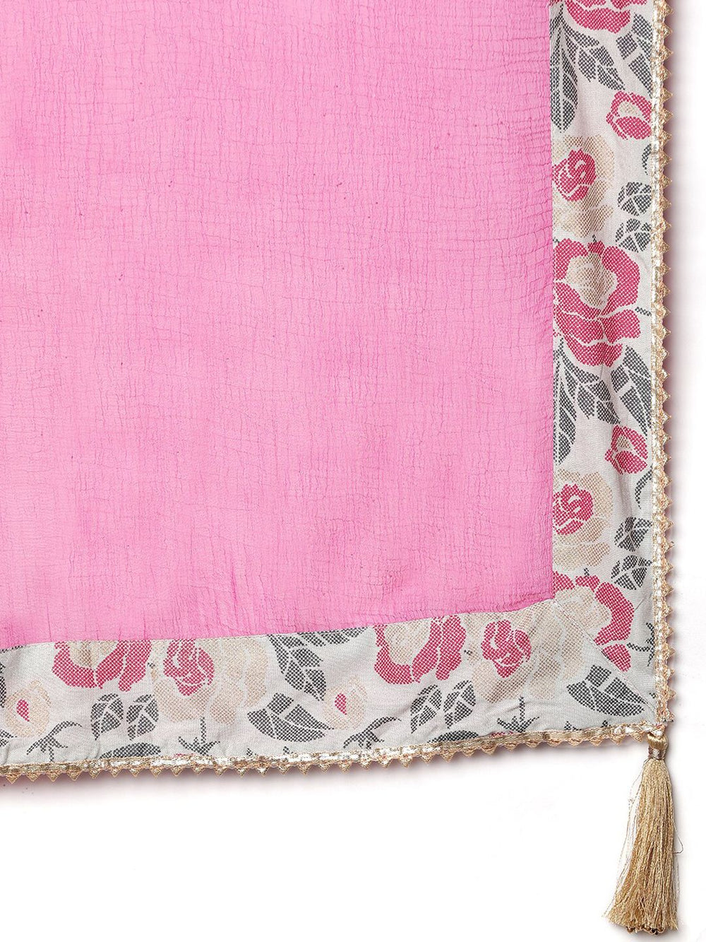 • Dupatta: Pink and cream solid poly chiffon dupatta with taping border