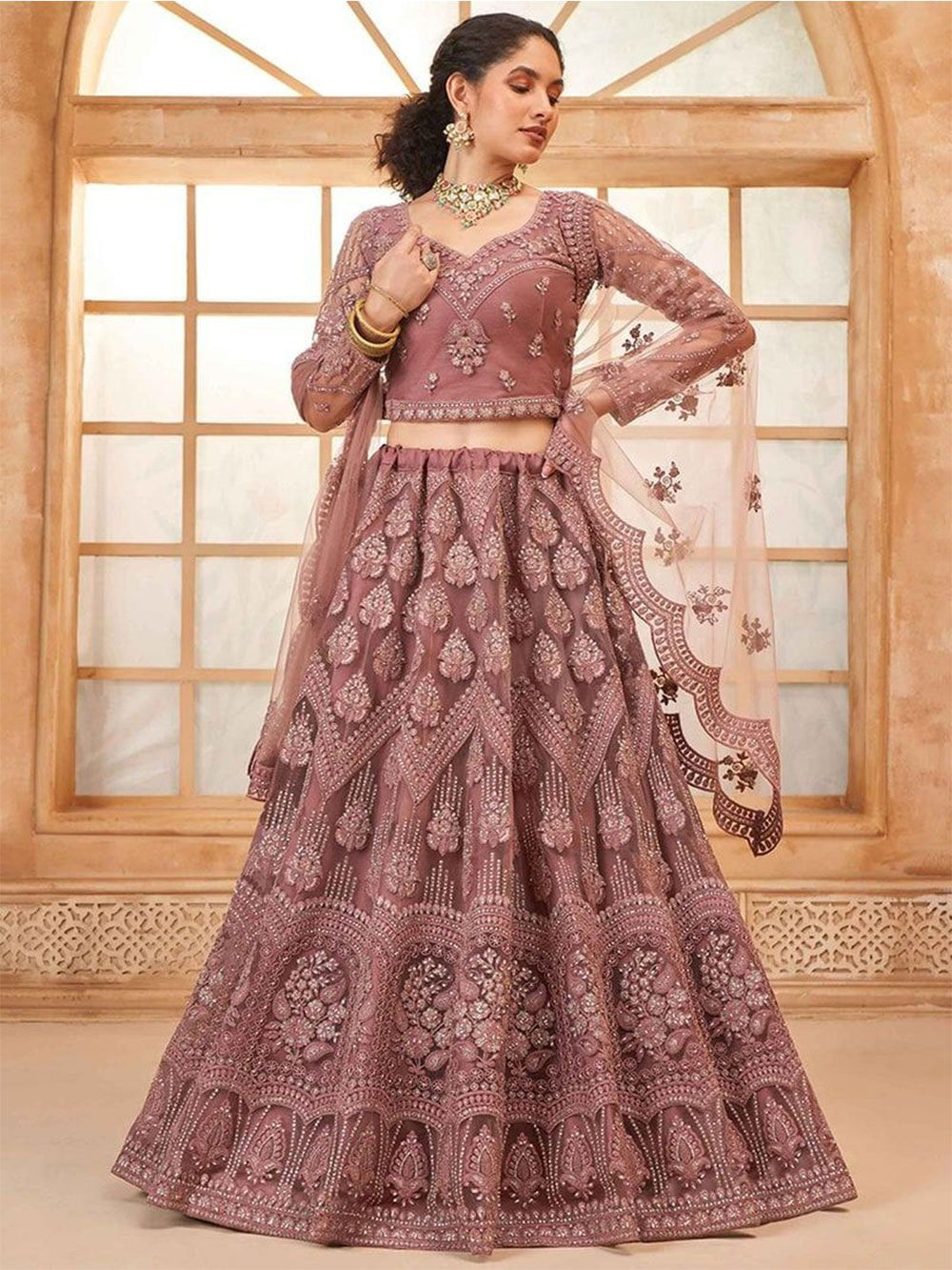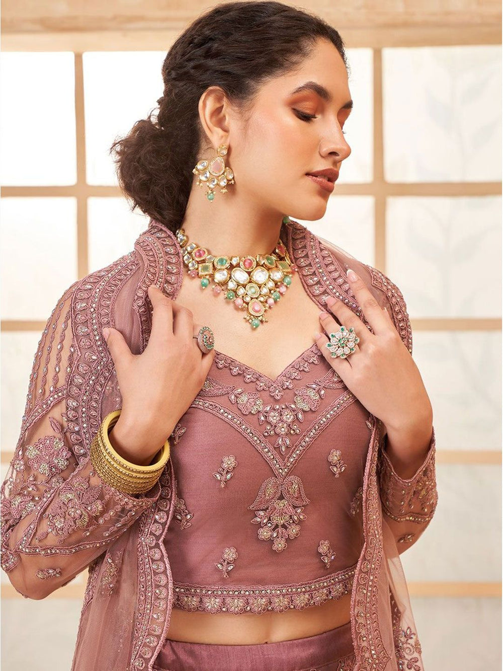This pink and silver lehenga choli set features exquisite bead and stone embellishments with a shimmery flared silhouette. The coordinated net dupatta completes the festive look.
