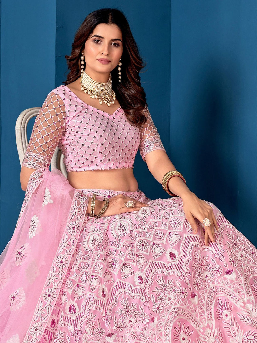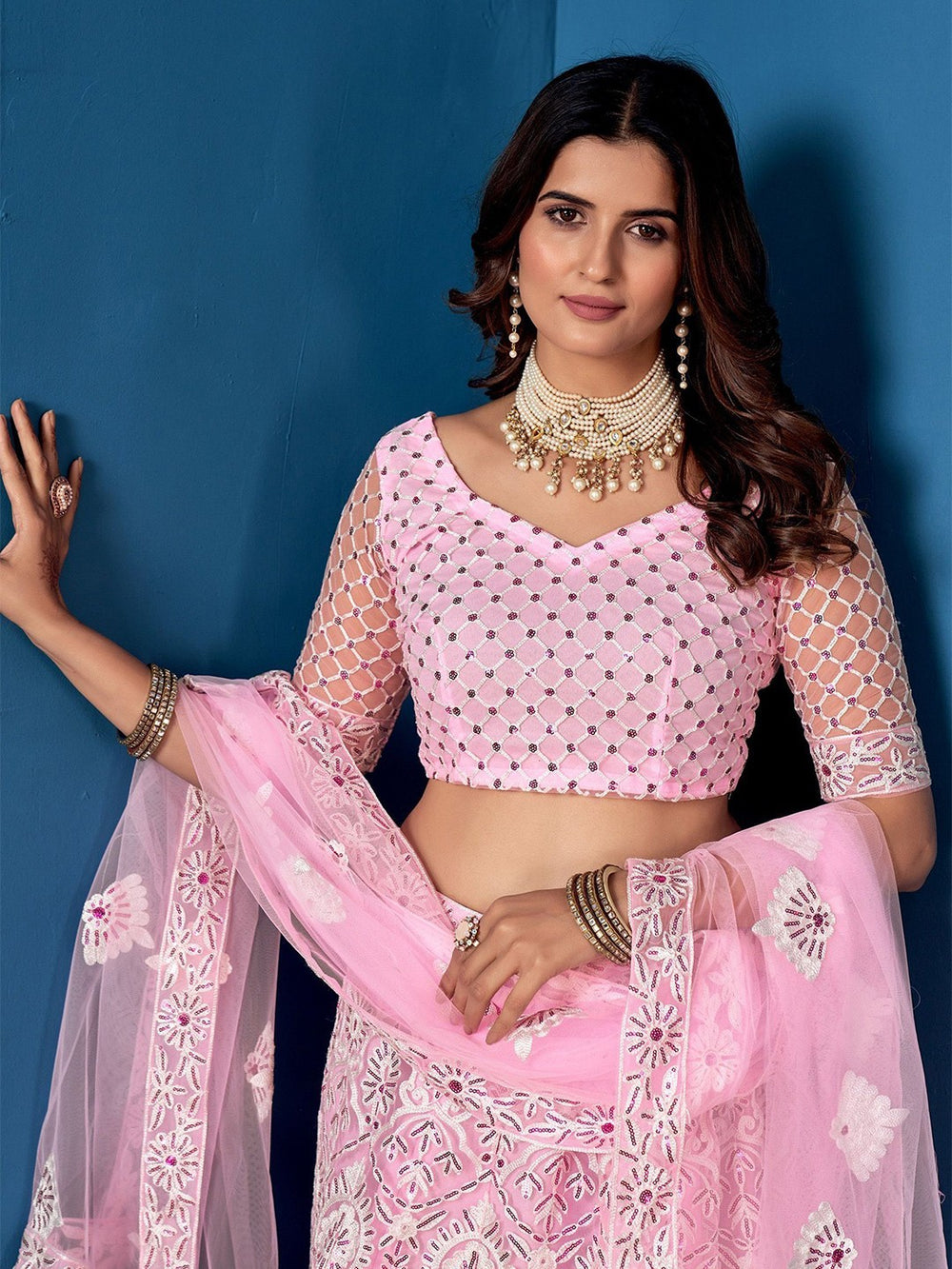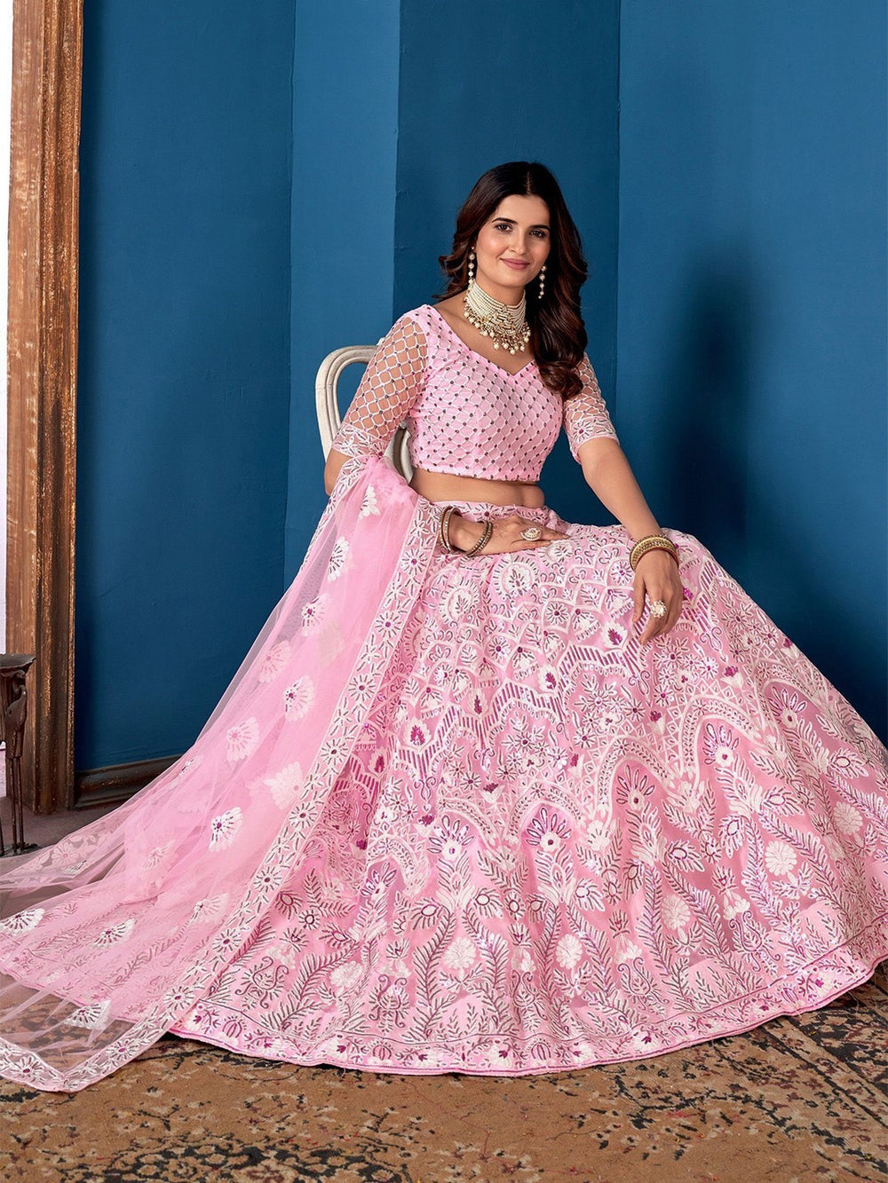 Fabric: Lehenga, Blouse & Dupatta – Net; Lining – Satin