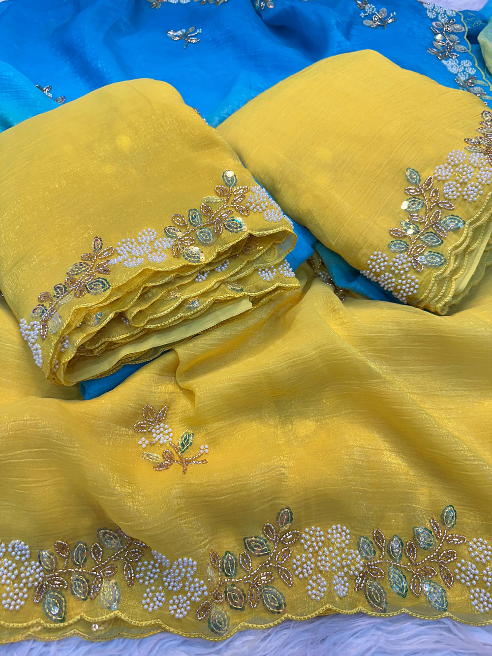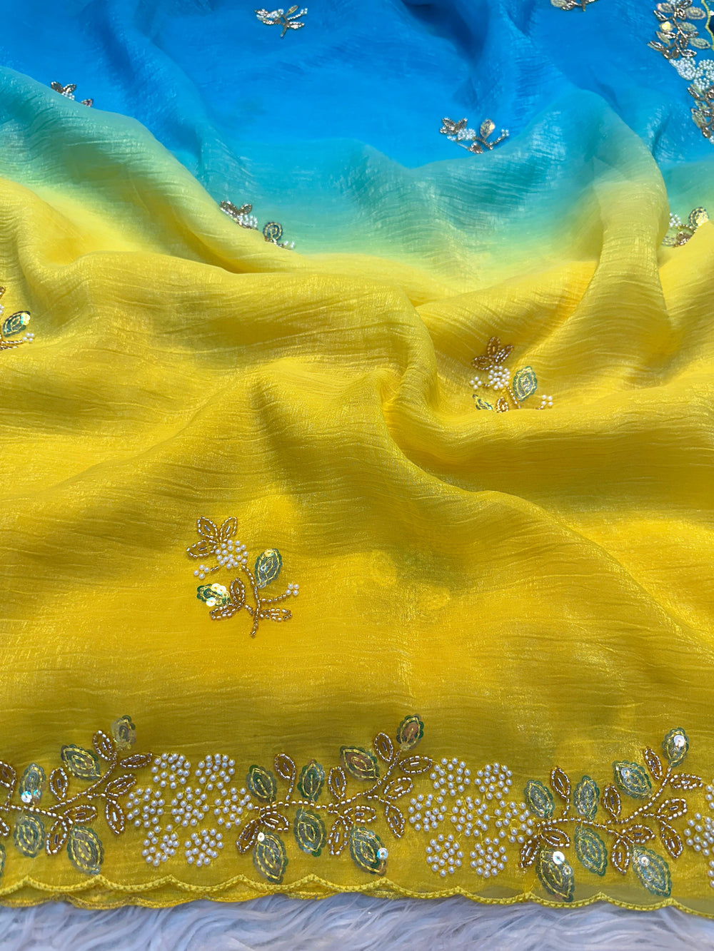 Style: Designer saree with sequins, cutdana, and moti ornamentation