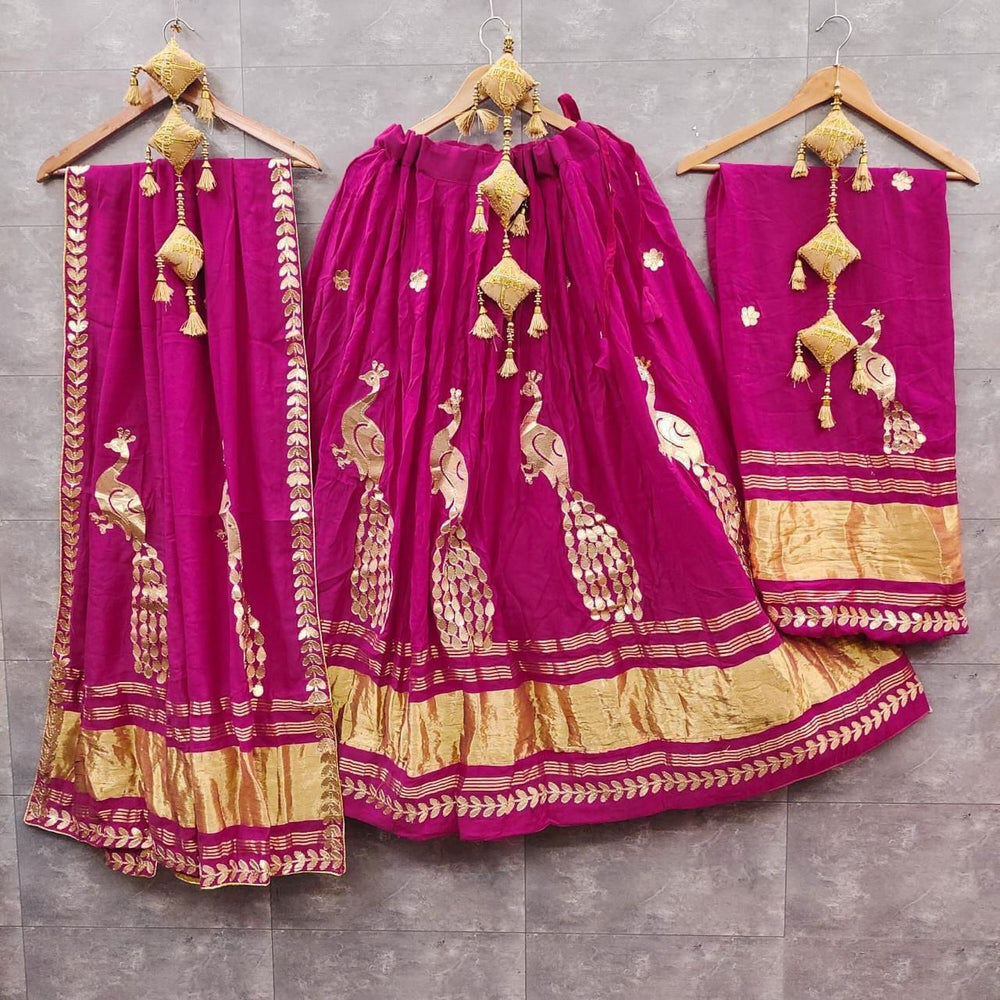 Elevate your wedding look with this exquisite Rani Pink Modal Gajji Silk Lehenga set, adorned with traditional gota work and crafted for elegance and comfort.