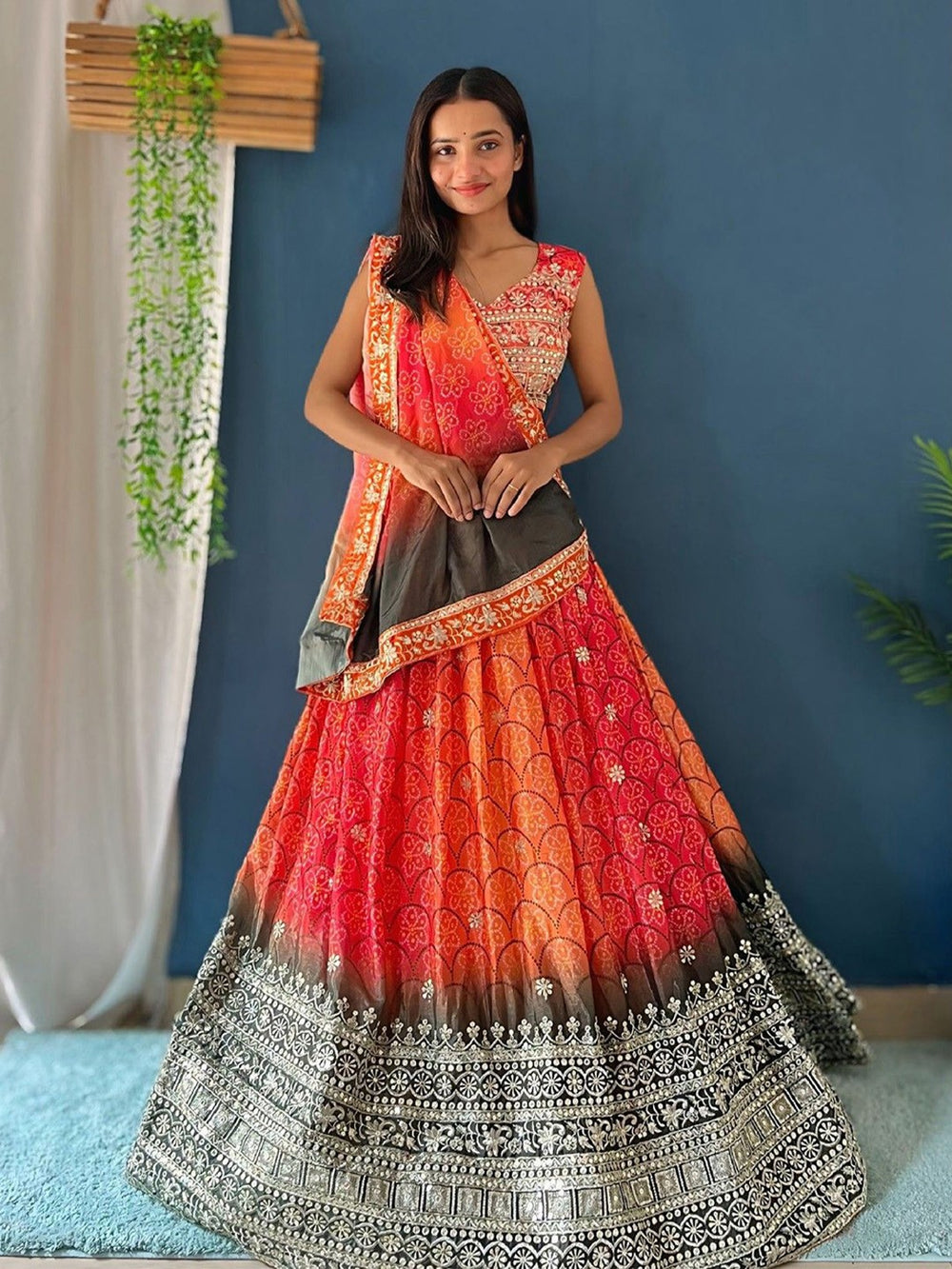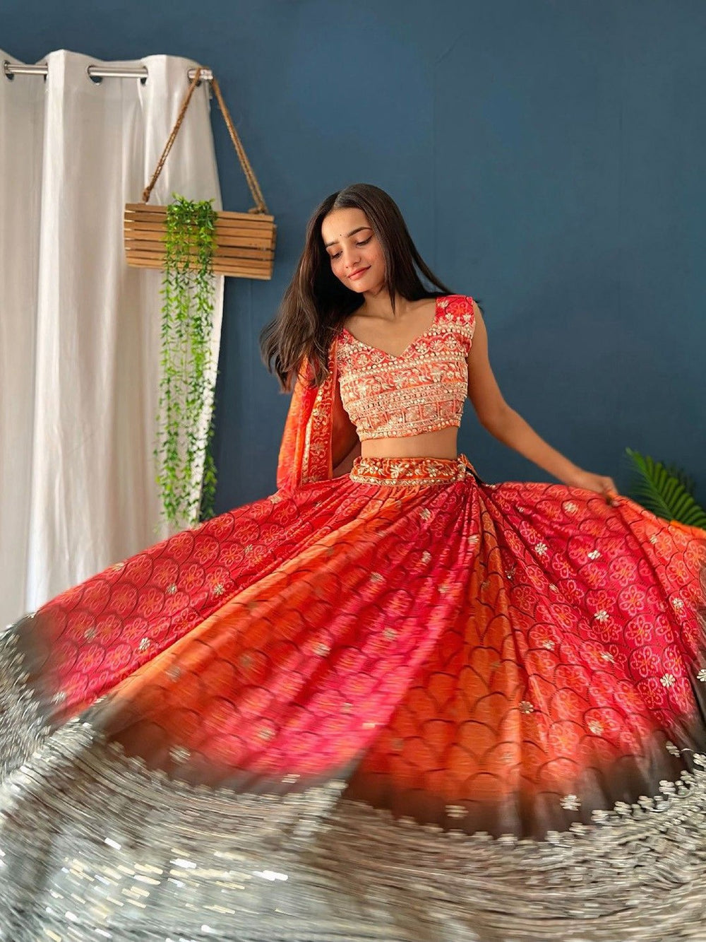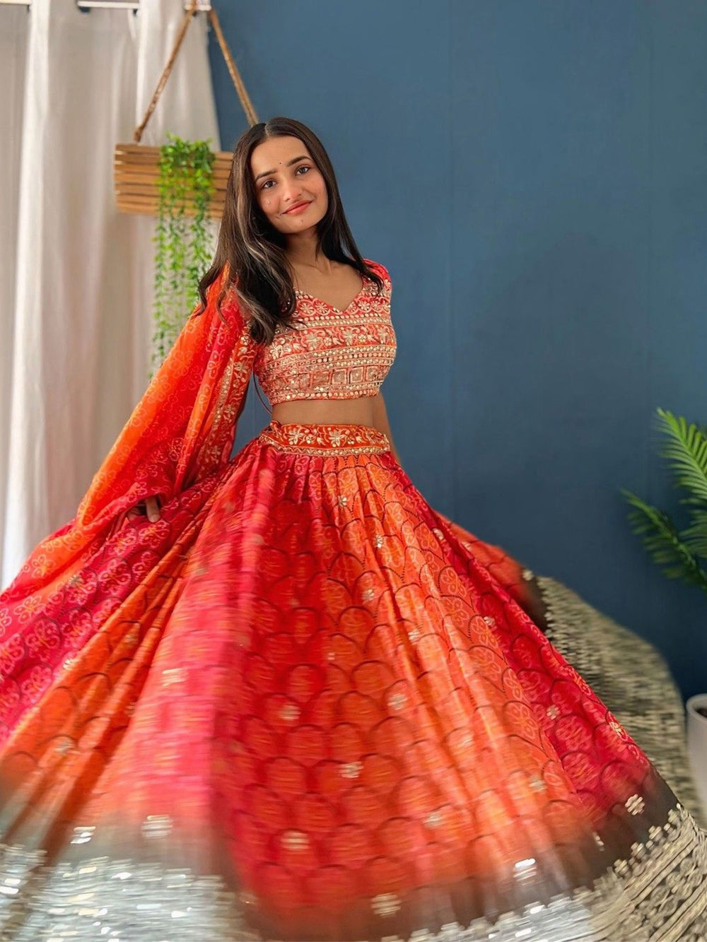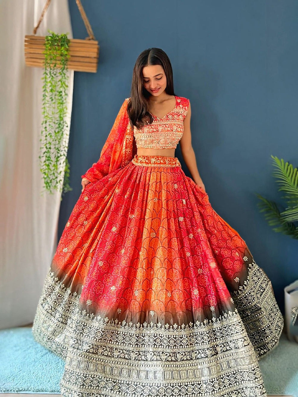 Fabric: Lehenga, Blouse & Dupatta – Art Silk (Chinon Silk); Lining – Silk with heavy cancan and canvas patta