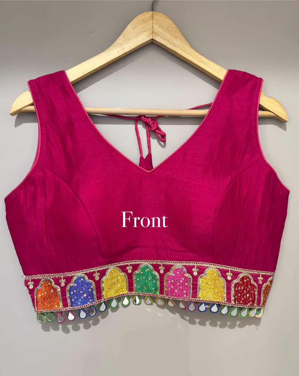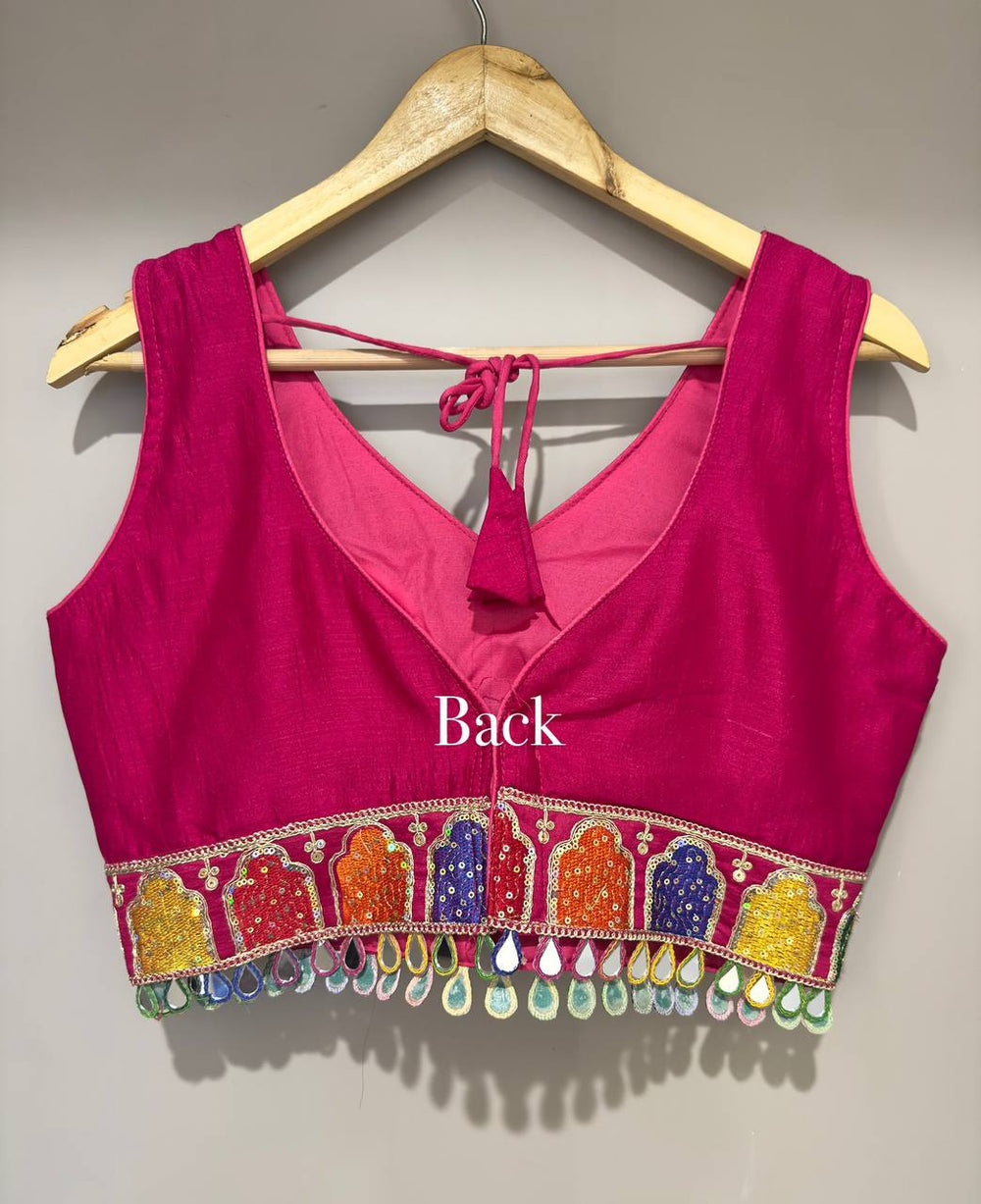 Elevate your festive style with this stunning silk princess cut blouse featuring intricate embroidery and real mirror work.