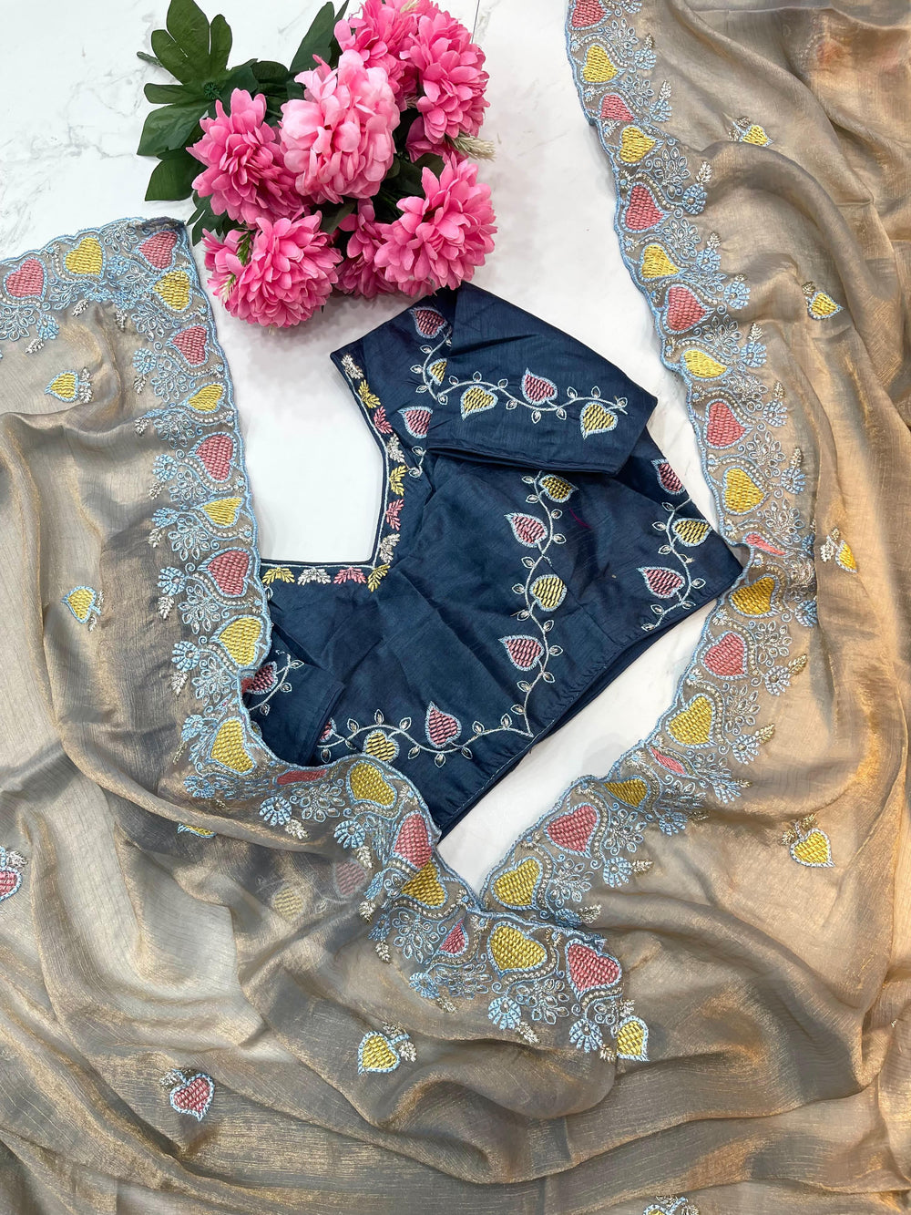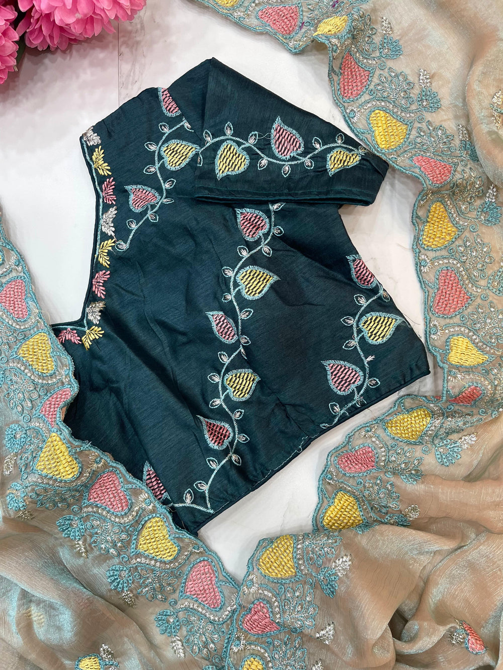• Blouse: Fully stitched embroidery work blouse, fits up to 42"