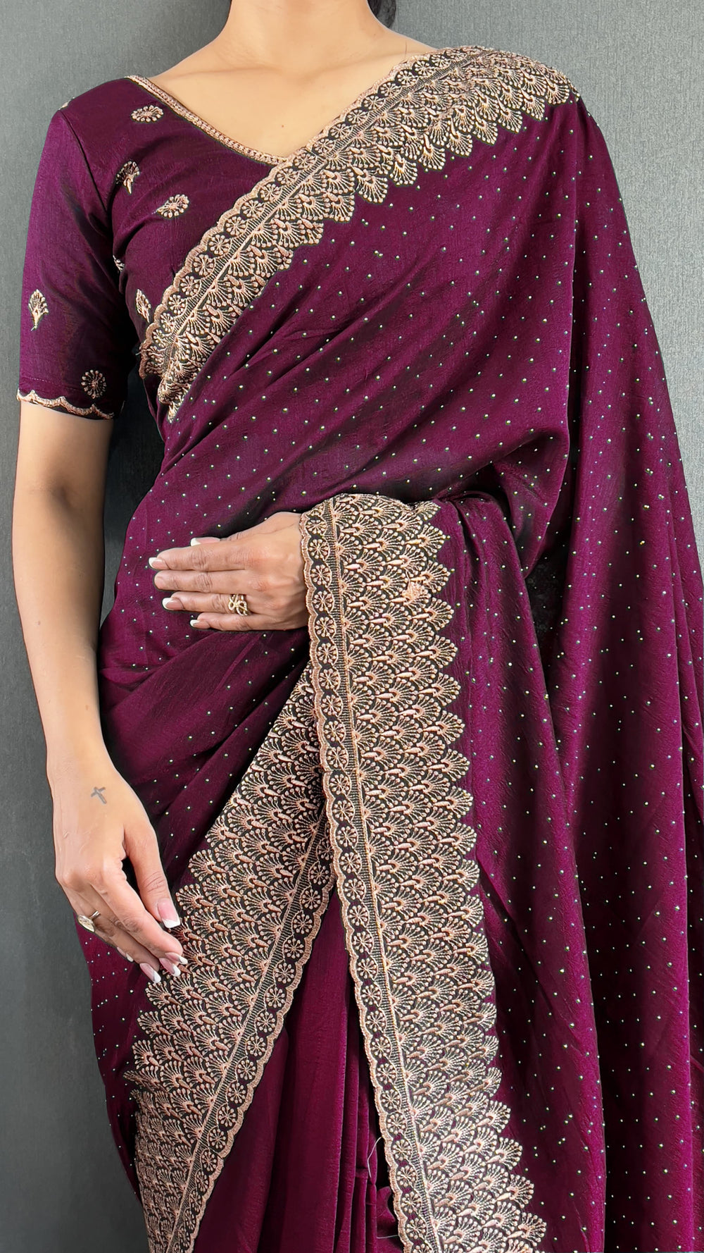 Elevate your ethnic wardrobe with this ready to wear saree crafted from premium blooming vichitra silk and adorned with intricate zari and DMC Swarovski work, complete with a stylish cut work border.