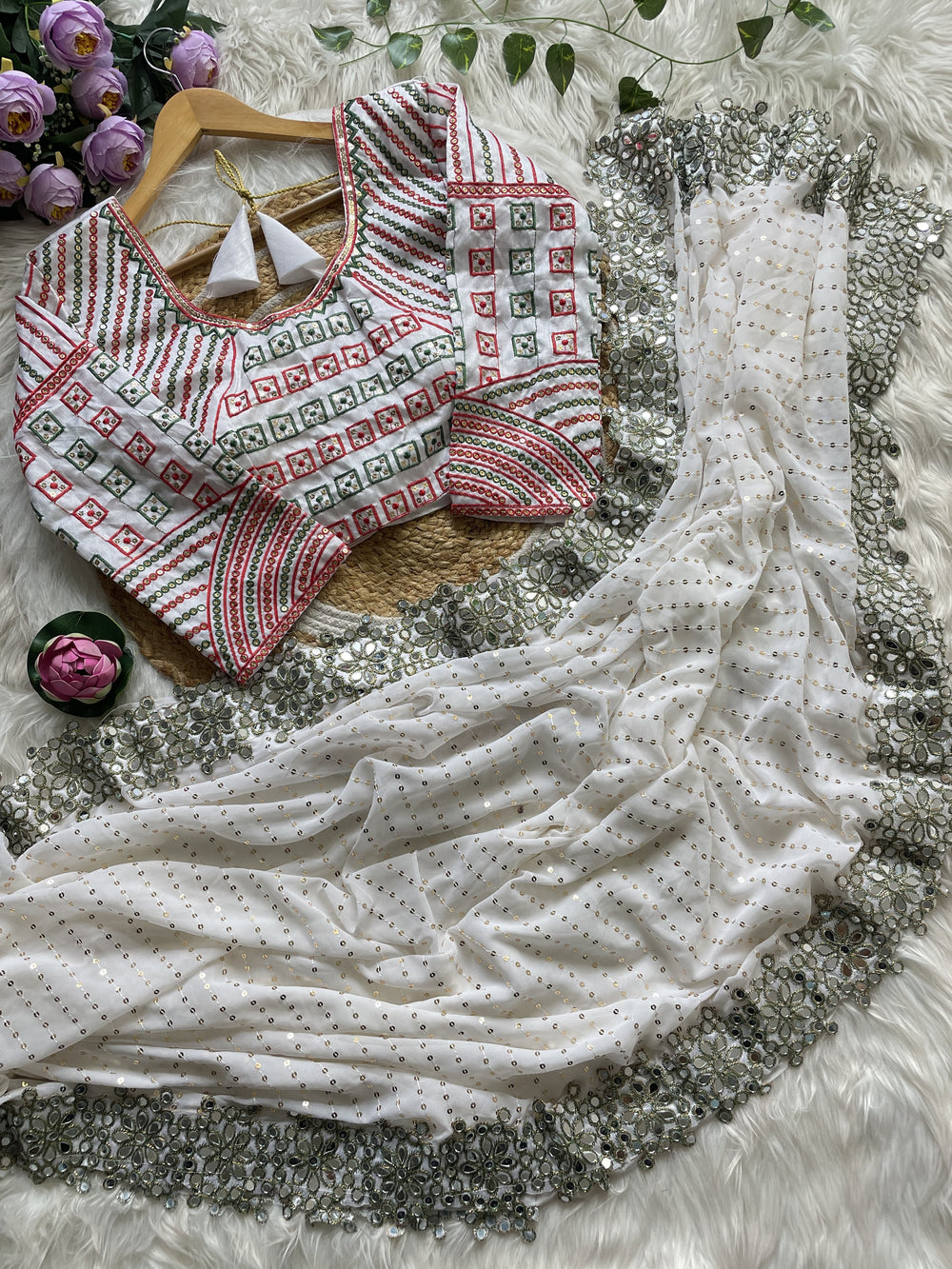 Make a statement at your next special occasion with this elegant white saree adorned with intricate sequin and mirror work.