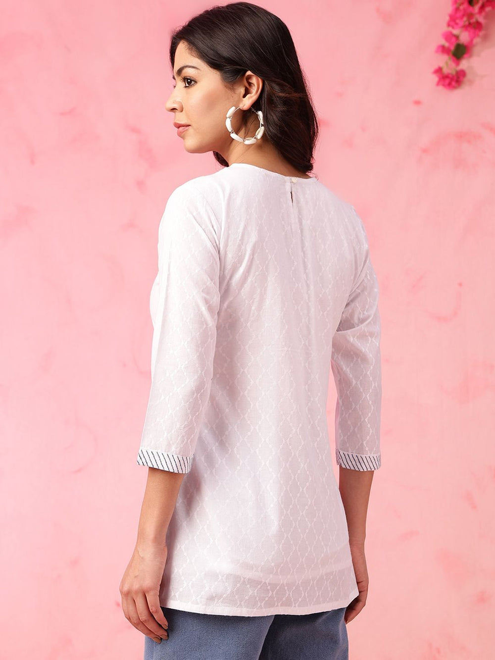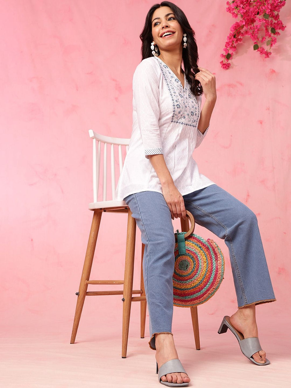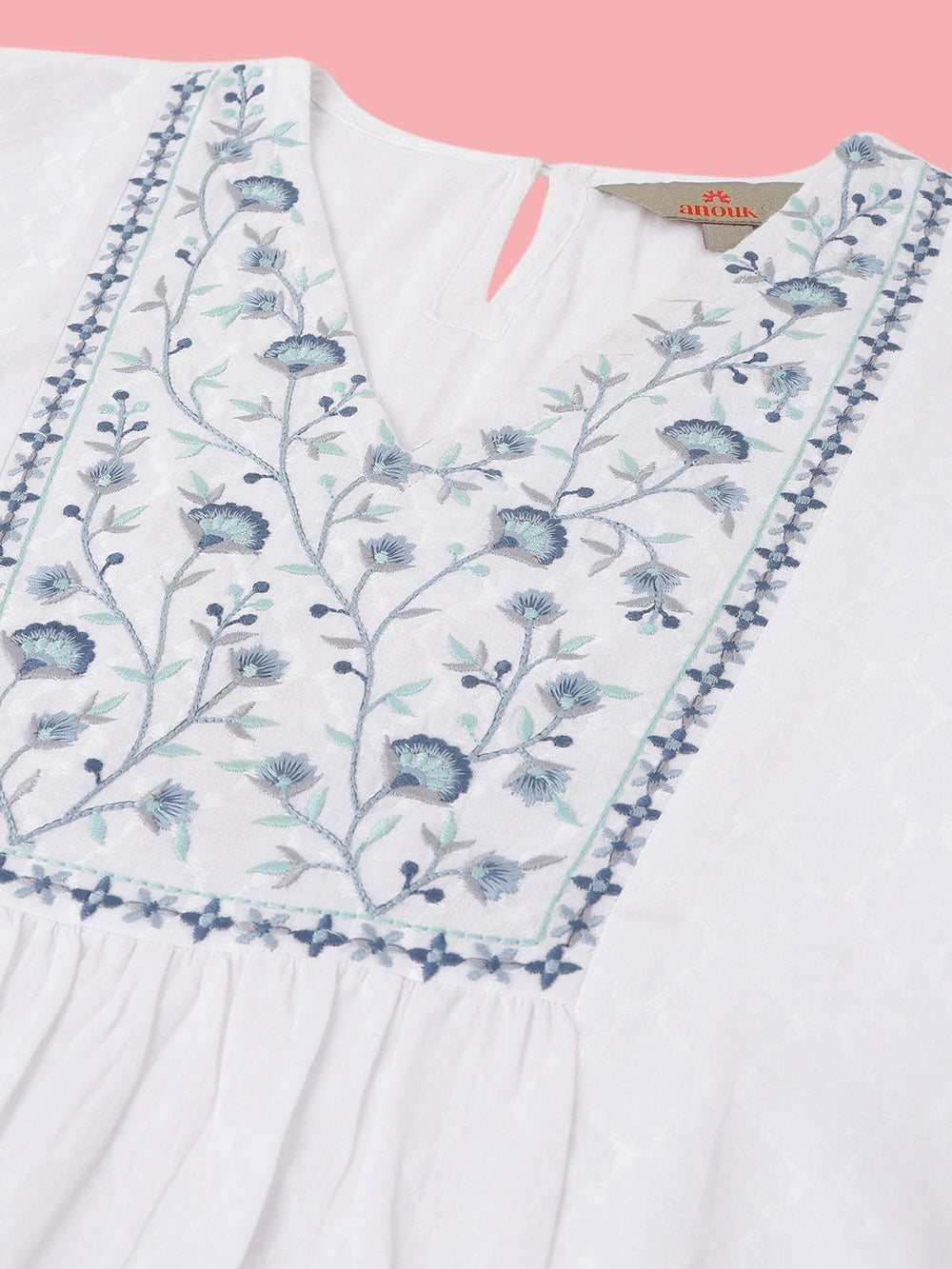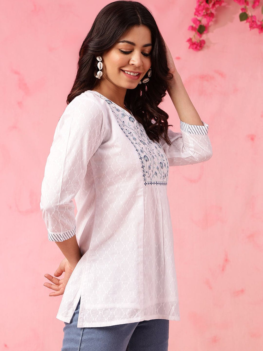 A breezy pure cotton kurti with elegant floral embroidery, designed for versatile everyday style.