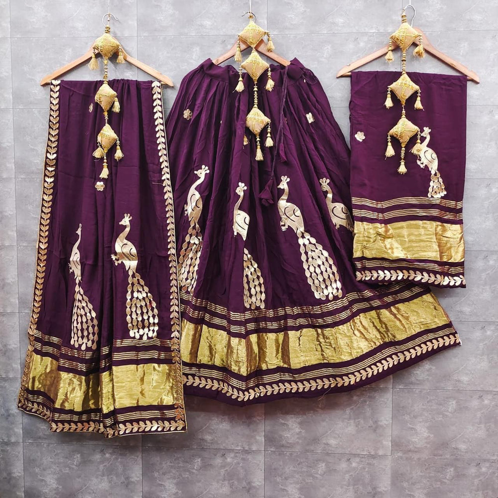 Elevate your wedding style with this luxurious modal gajji silk lehenga set adorned with intricate gota work and an elegant lagadi patta dupatta.