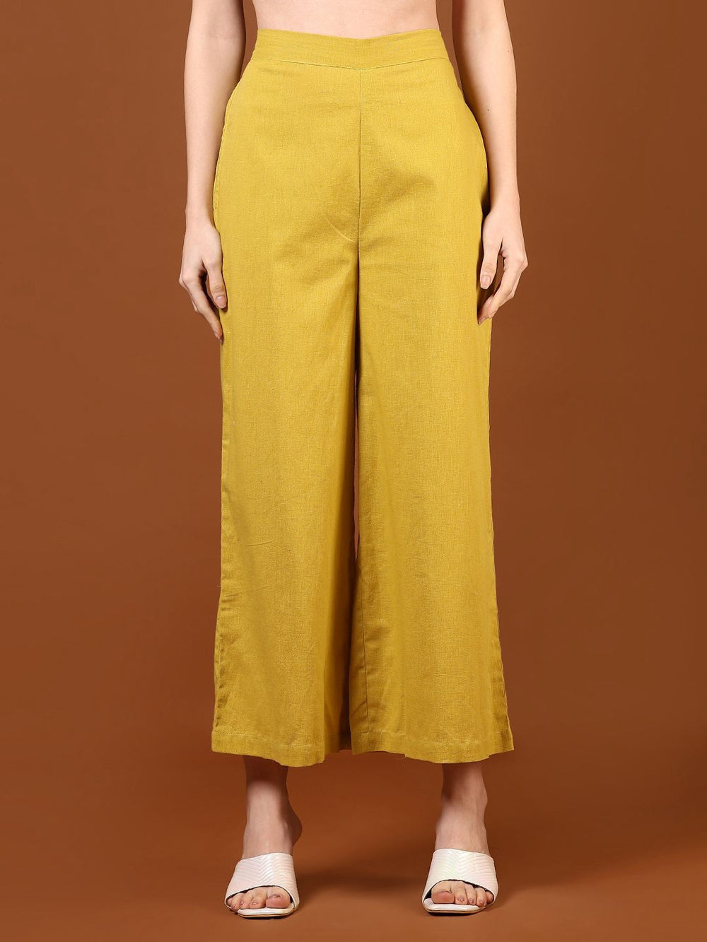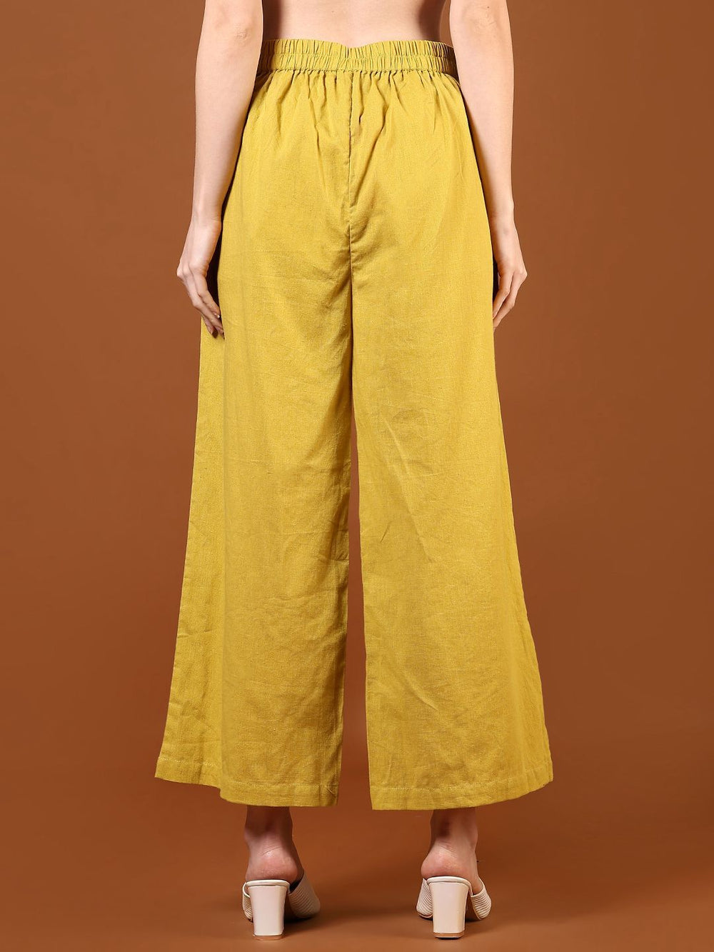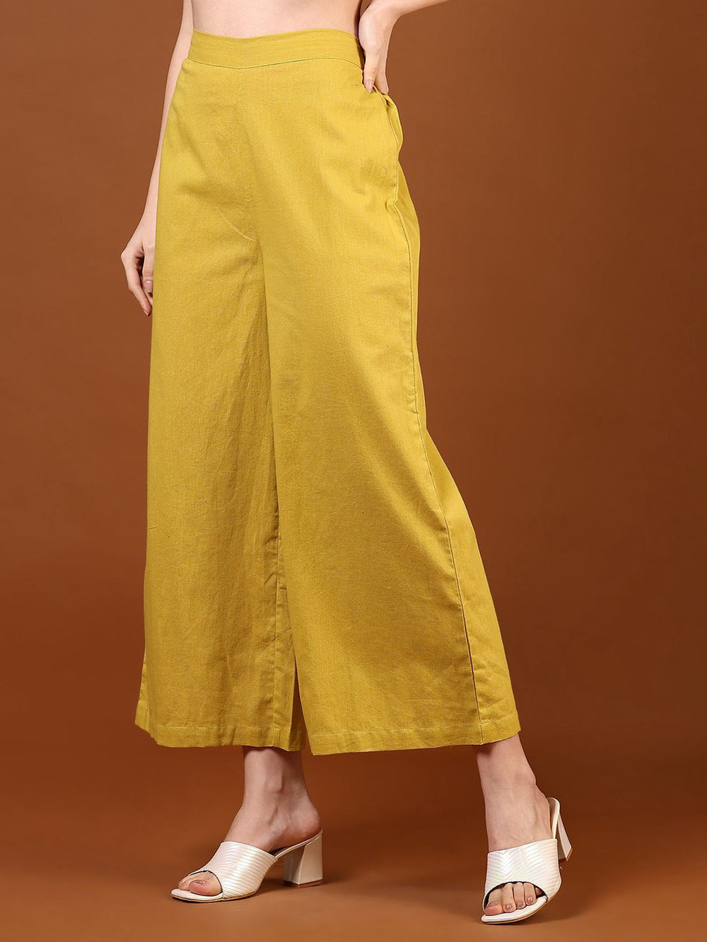 Upgrade your wardrobe with these stylish and comfortable yellow cotton palazzos, perfect for both casual and relaxed looks.